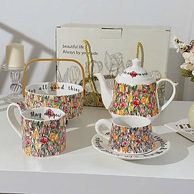 Chi Tiết Bộ Sản Phẩm: • 1 ấm trà: Dung tích 900ml. • 6 chén trà: Dung tích 170ml mỗi chén. • 1 âu đựng đường và 1 ca sữa: Dung tích 200ml mỗi món.