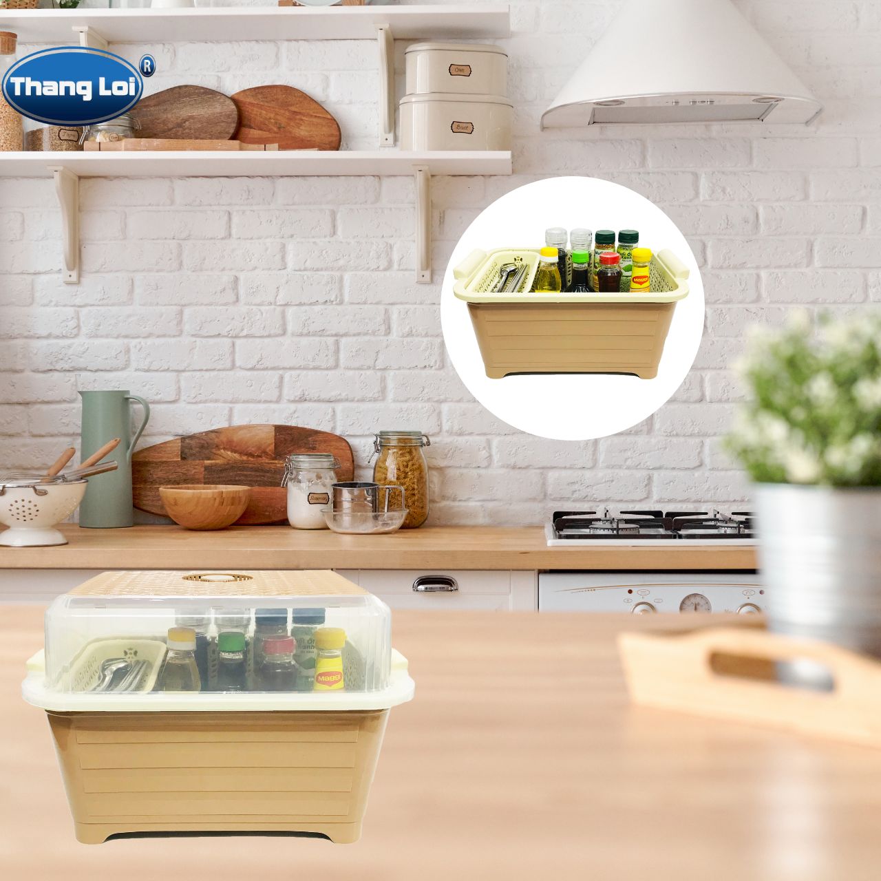 Thau rổ úp chén có nắp với thiết kế tiện ích hai lớp dễ dàng vệ sinh, tháo gỡ, mang đi.
