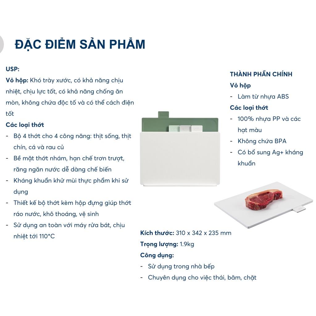 - Rau củ Bề mặt thớt nhám, hạn chế trơn trượt, răng ngăn nước dễ dàng chế biến. Kháng khuổn khử mùi thực phẩm khi sử dụng Thiết kế bộ thớt kèm hộp đựng giúp thớt ráo nước, khô thoáng, vệ sinh Sử dụng an toàn với máy rửa bát, chịu nhiệt tới 110*C THÀNH PHẦN CHÍNH Vỏ hộp -- Làm từ nhựa ABS Các loại thớt - 100% nhựa PP và các hạt màu - Không chứa BPA - Có bổ sung Ag+ kháng khuẩn Kích thước: 310 x 342 x 235 mm Trong lượng: 1.9kg Công dụng: - Sử dụng trong nhà bếp - Chuyên dụng cho việc thói, băm, chặt - Có hộp bảo vệ, có rang thoát nước, giúp thớt kho ráo - 4 thớt cho 4 công năng khác nhai - Phù hợp với mọi mục đích sử dụng (chặt, thái, băm…) - Sử dụng cả 2 mặt - Chuyên cắt thái -_ Sản phẩm trang nhã, mỏng nhẹ, phù hợp với sử dụng như 1 chiếc đĩa.