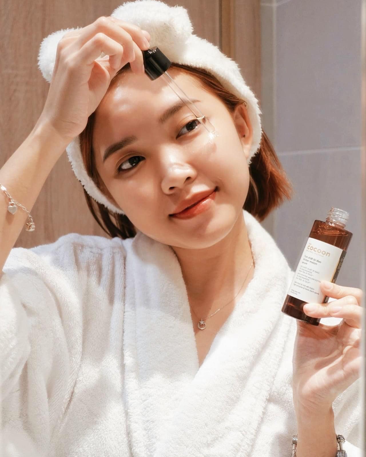 - Vitamin B3 (Niacinamide): Giúp hỗ trợ hết mụn hiệu quả, kiểm soát lượng dầu thừa và làm giảm sự xuất hiện của lỗ chân lông to. Thành phần đầy đủ tinh chất bi đao cocoon Aqua/Water, Niacinamide, Salicylic Acid, Cocamidopropyl Dimethylamine, Benincasa Cerifera Fruit Extract, Centella Asiatica Extract, Butylene Glycol, Pentylene Glycol, Bisabolol, Zinc PCA, Phellodendron Amurense Bark Extract, Glycereth-26, Bis-PEG-18 Methyl Ether Dimethyl Silane, Melaleuca Alternifolia Leaf Oil, Lavandula Angustifolia Flower Oil, Rosmarinus Officinalis Leaf Oil, Phenoxyethanol, Trisodium Ethylenediamine Disuccinate, Ethylhexylglycerin, Farnesol. Hướng dẫn sử dụng tinh chất bi đao cocoon Lấy vài giọt tinh chất vào lòng bàn tay, xoa đều và mát-xa lên da mặt sạch, tránh vùng mắt. Sử dụng sáng và tối. Cam kết tinh chất bi đao cocoon