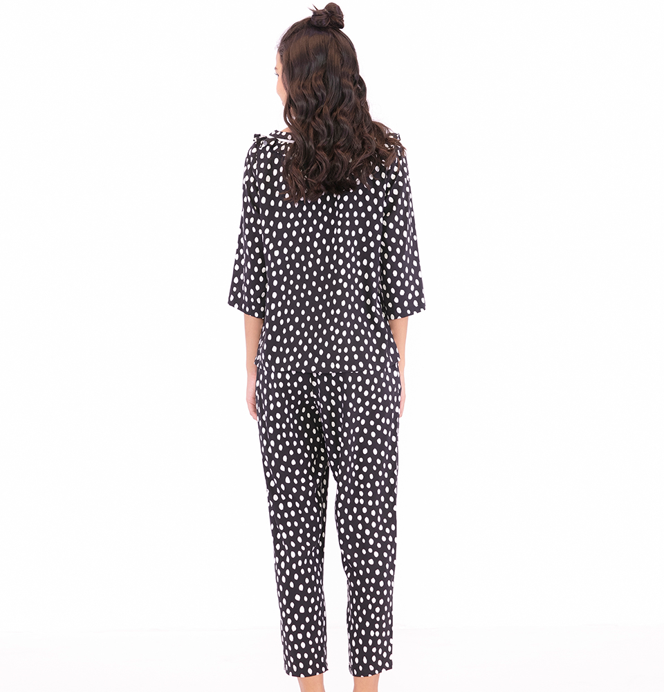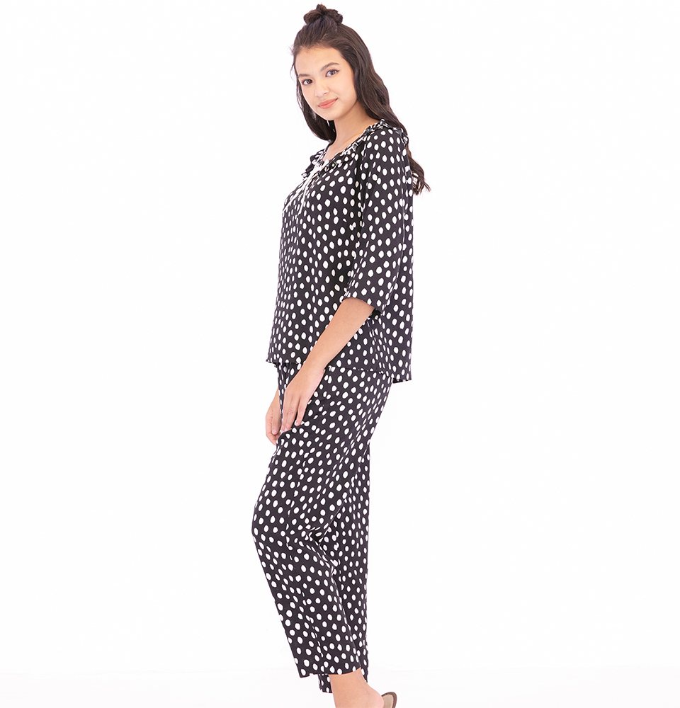Đồ bộ mặc nhà cổ tròn màu nâu họa tiết chấm bi nhí - LA MỘC chất liệu vải SATIN LỤA. Thiết kế chú trọng từng đường may. Mang lại cảm giác thoải mái cho