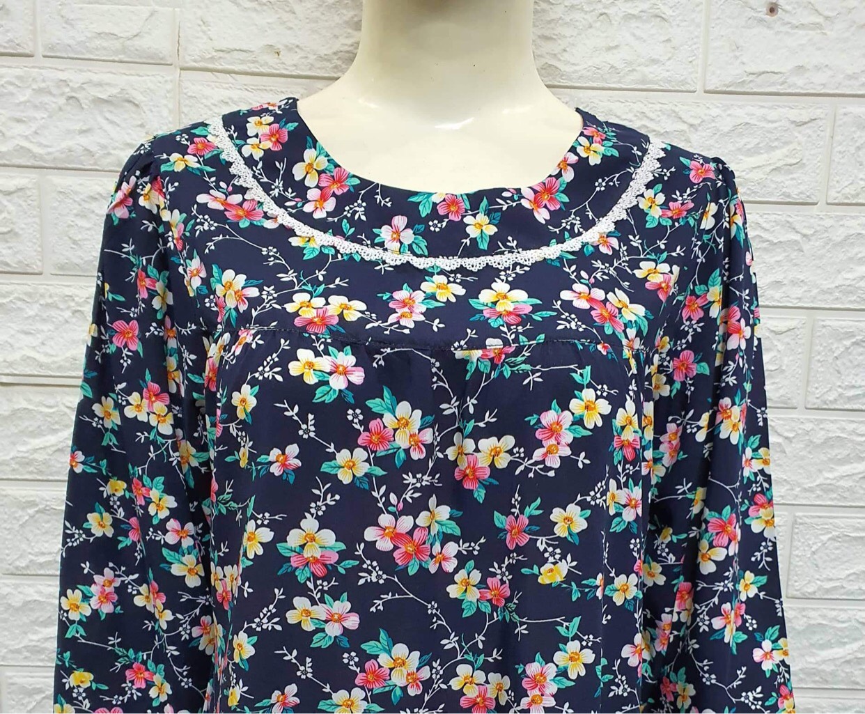 Đặc điểm nổi bật: - Cổ lá sen, tay lỡ - Kẹp ren trắng ở phần lá cổ, lai tay, lai quần - Chất liệu thun - Dáng bộ đồ dài - Thiết kế và