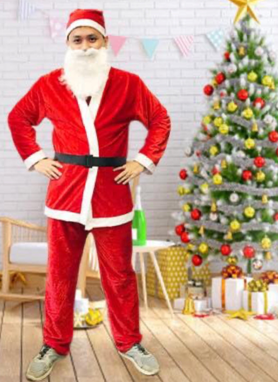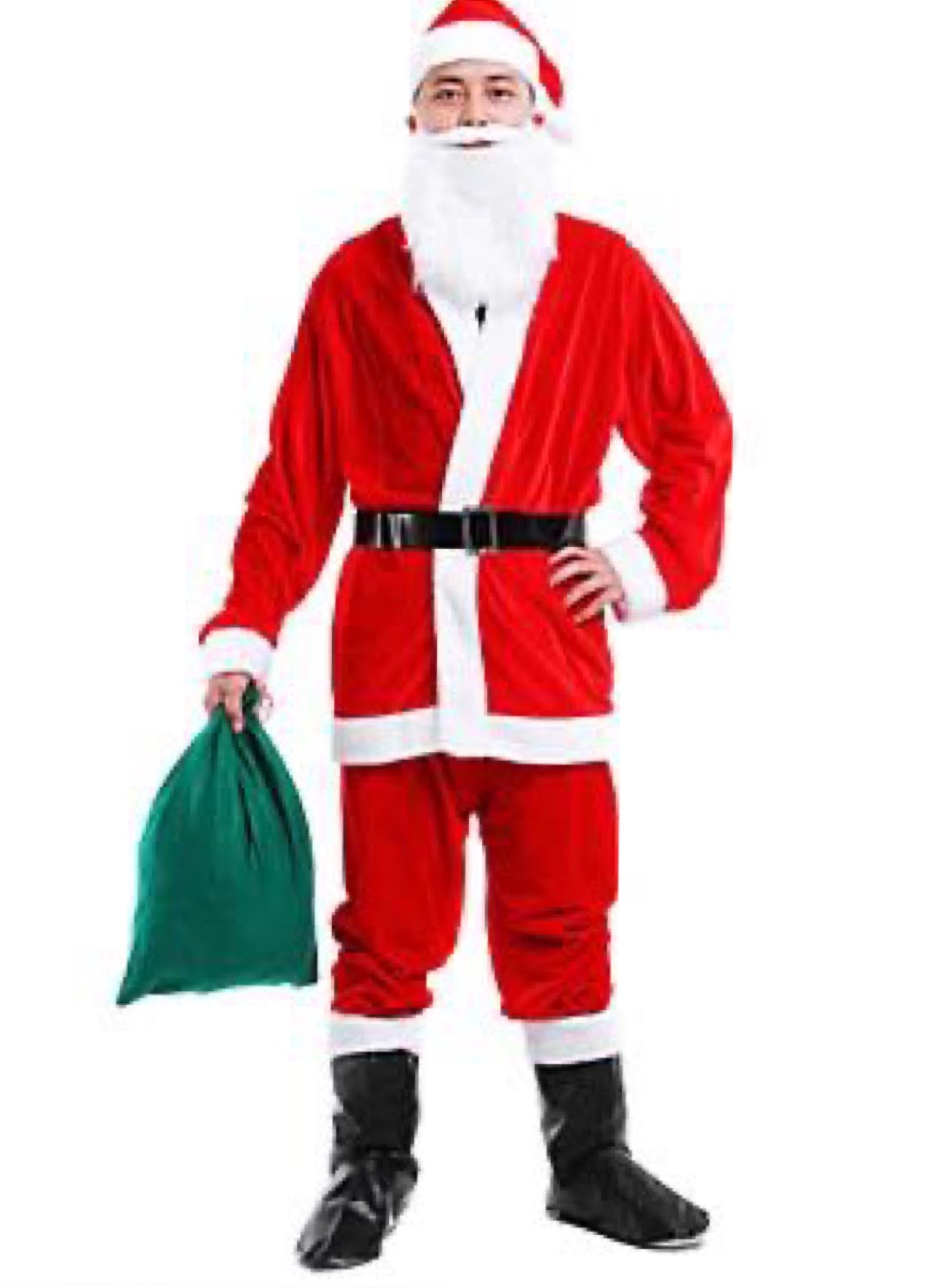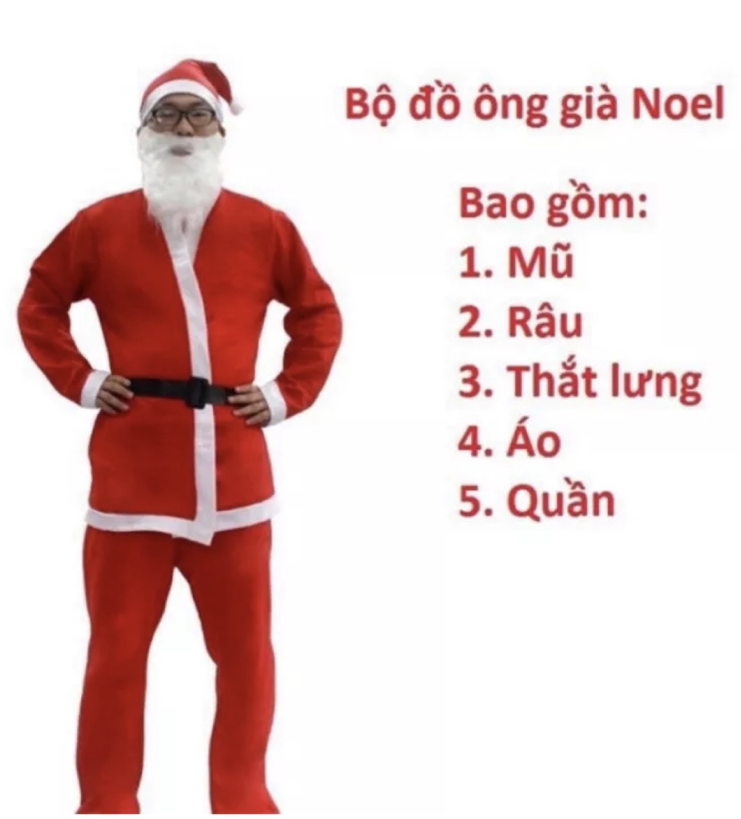 Bộ quần áo ông già noel chất liệu Nhung và vải nỉ freesize cho người dưới 90kg tuỳ theo chiều cao Bộ gồm: - quần - áo - mũ - râu - đai - bộ