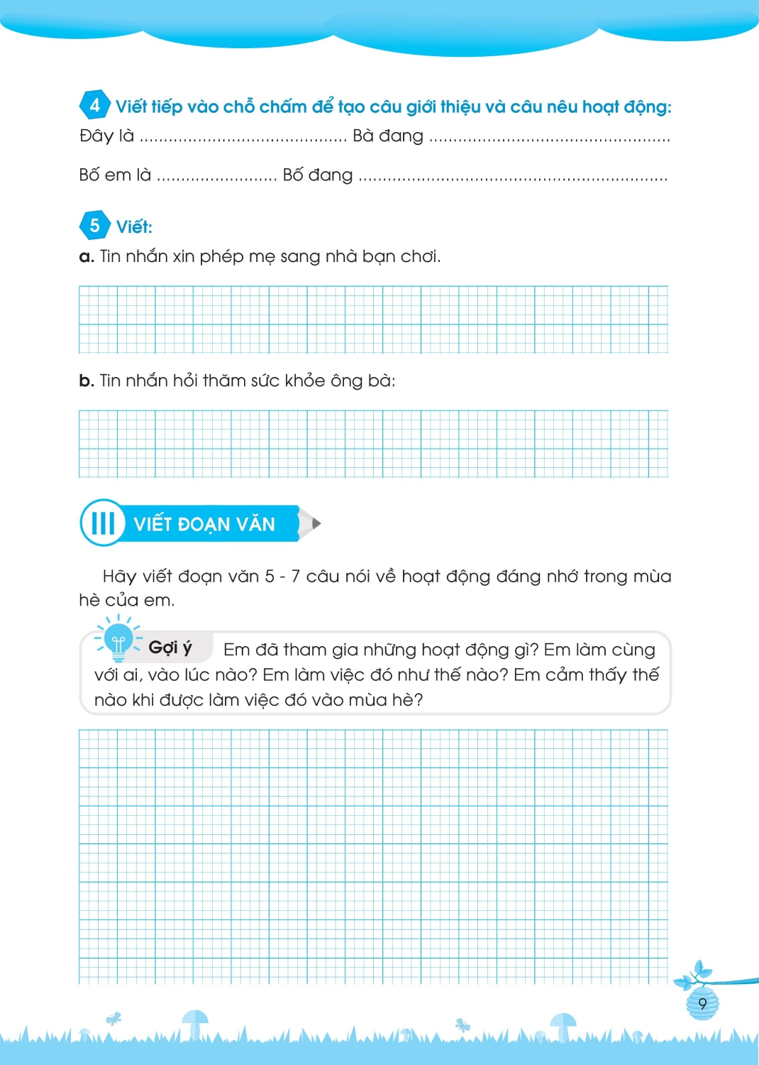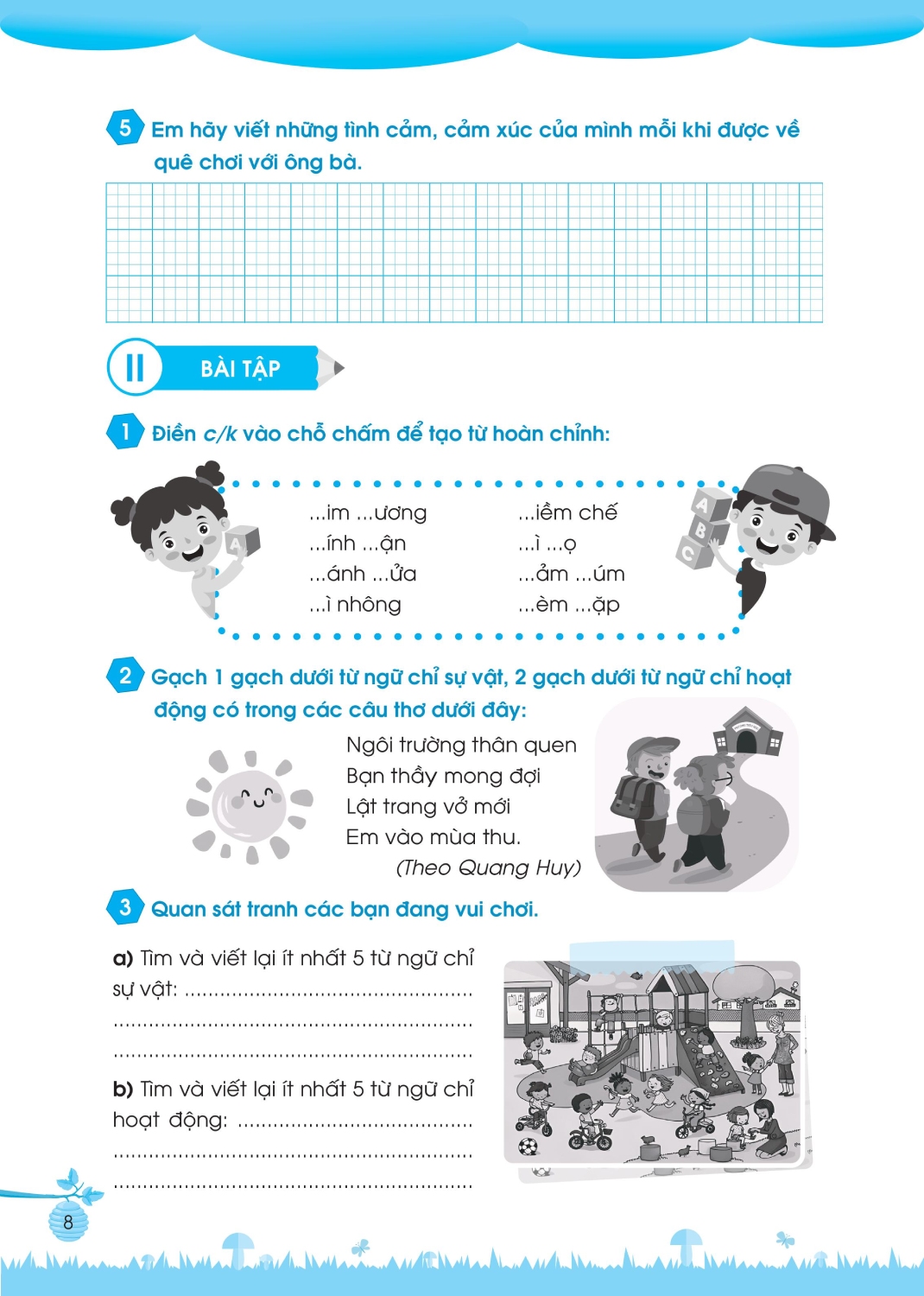 - Bài tập cơ bản: Các bài tập trong phần này được thiết kế sinh động, đầy cảm hứng với rất nhiều các hoạt động giúp khơi gợi hứng thú học và làm bài tập của các em, đồng thời giúp các em củng cố và nắm chắc các kiến thức Tiếng Việt đã học.