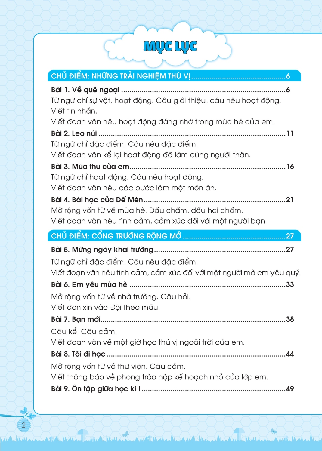 - Bài tập nâng cao: Phần này sẽ cung cấp 1 số các bài tập và hoạt động mang tính thử thách hơn, để các em thử sức, luyện tập tư duy sâu từ đó trau dồi và nâng cao kiến thức. Cuốn sách cũng cung cấp 3 đề ôn tập cuối kì với thang điểm cụ thể, để các em tự ôn luyện và đánh giá đúng mức độ nắm kiến thức, chuẩn bị tốt kiến thức và tâm lý cho bài kiểm tra cuối kì.