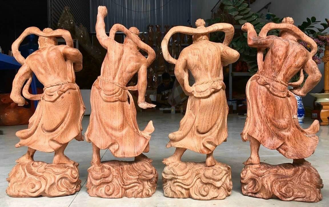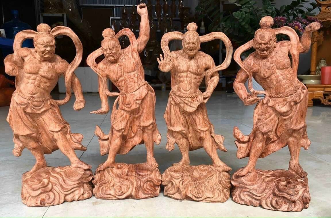 _ Bộ tượng tứ đại kim cương được  trạm khắc vô cùng tỉ mỉ tinh sảo kỳ công .Đi hầu hết tất cả mọi chi tiết góc ngách nội dung hoa văn của tượng đều được ngọt tỉa chỉnh sửa hoàn toàn bằng tay thủ công .Đồng thời tượng được kiểm định vô cùng khắt khe ,Như cho vào thẩm sấy cho gỗ khô kiệt .Mục đích trống dập nứt vênh mo mối mọt song cho vào trà nhám, cho sạch sẽ sờ mát lạnh song cho vào  ,phun lót làm bóng mờ để giữ lại mầu sắc vân gỗ tự nhiên ,Tượng được làm và hoàn thiện do bàn tay khối óc tài hoa ,Từ những người thợ giàu kinh nghiệm cũng như tay nghề cao trong làng nghề truyền thống .Tượng được làm và hoàn thiện do bàn tay khối óc tài hoa ,Từ những người thợ giàu kinh nghiệm cũng như tay nghề cao trong làng nghề truyền thống ,Chính  vì thế bộ tượng tứ đại kim cương đã đáp ứng đầy đủ những tiêu trí ( Đẹp bền rẻ ) Thẩm mỹ nghệ thuật với chất lượng tuyệt vời