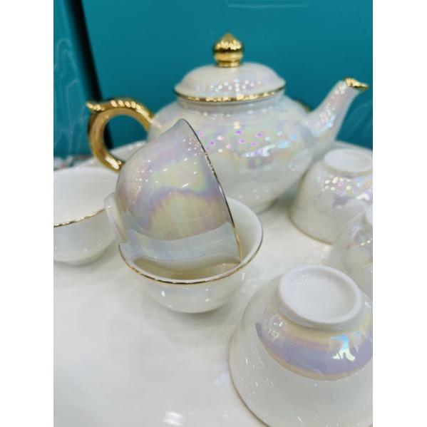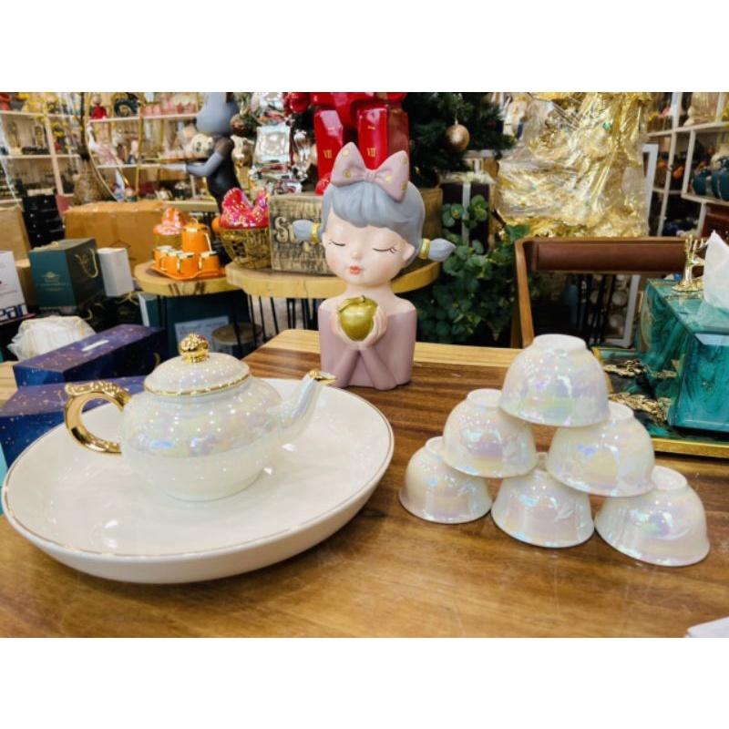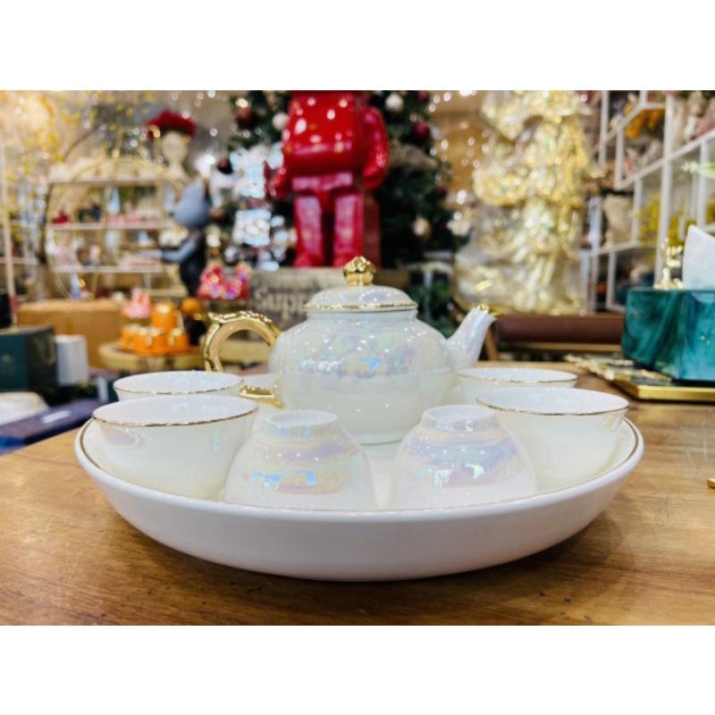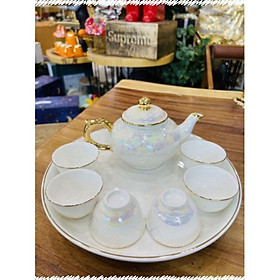 ✨Bộ uống trà,ấm chén 7 Sắc Trắng Viền Vẽ Vàng kèm khay Gốm Sứ Giang Tây cao cấp quà tặng ý nghĩa