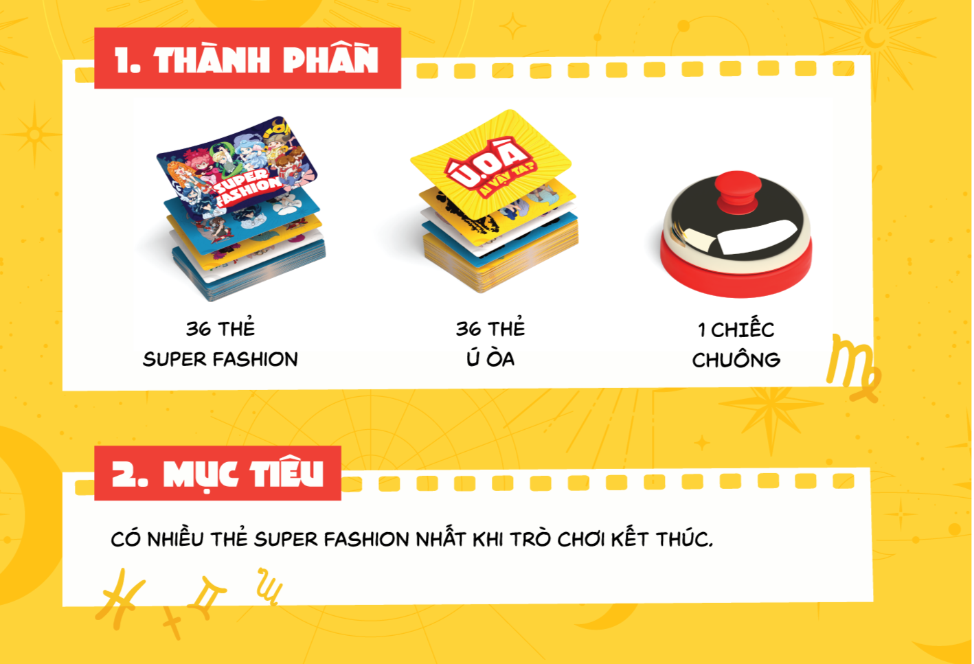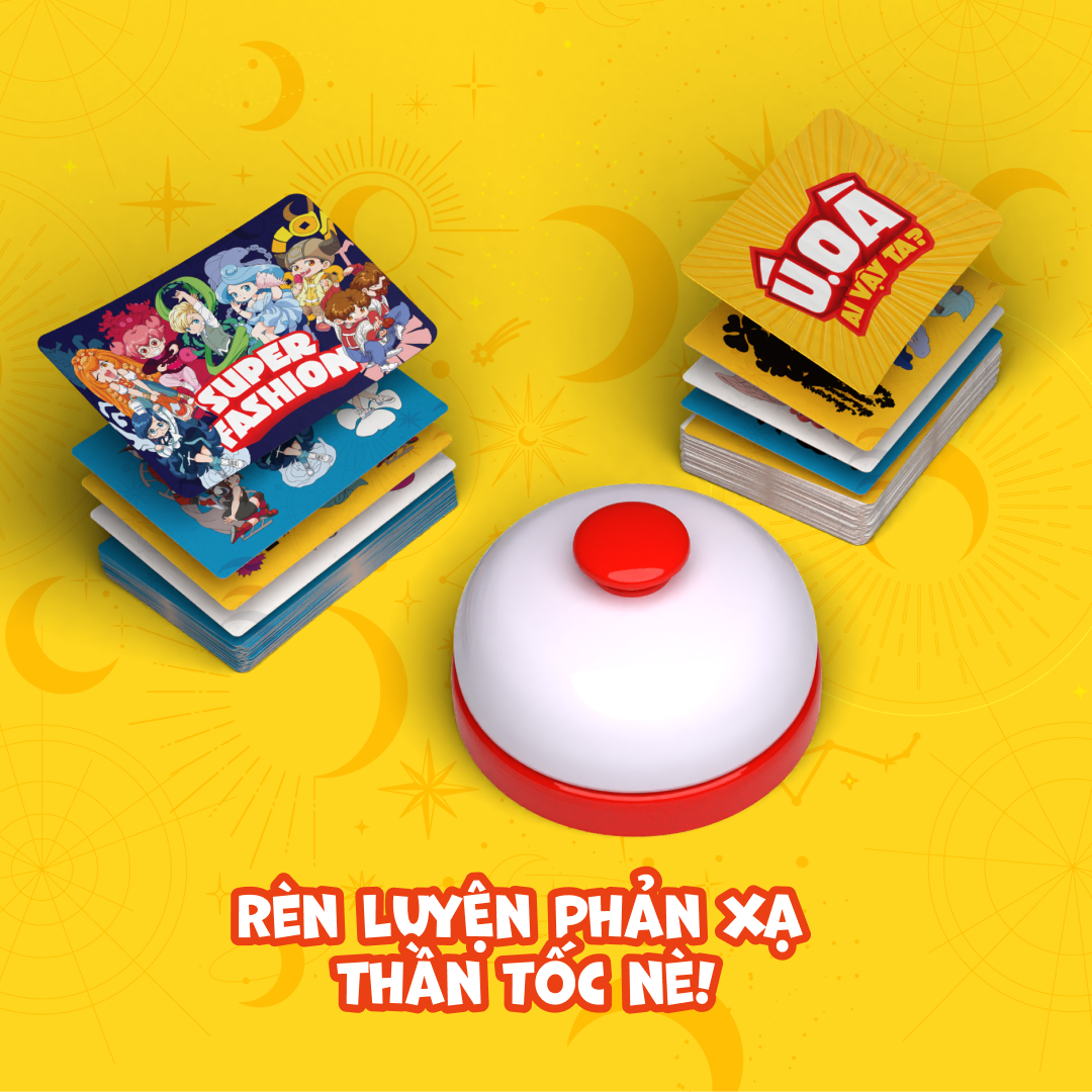 Giới thiệu Boardgame Lớp Học Mật Ngữ - Ú Òa - Ai Vậy Ta? Cùng truy tìm BÓNG ĐEN bí ẩn Tôi là đâu - Đây là ai? Đây là trò chơi rèn luyện kỹ năng nhanh tay nhanh mắt của người chơi. Ai là người thu thập được nhiều thẻ “Super Fashion” nhiều nhất sẽ là người chiến thắng! Hiểu luật trong 30s với cách chơi siêu đơn giản gồm các bước sau: Đặt chuông, 36 thẻ Super Fashion nằm ngửa giữa bàn và tráo các thẻ Ú Òa thành 1 chồng đặt úp bên cạnh Lật từng thẻ Ú Oà Bấm chuông và chỉ ra thẻ Super Fashion khớp với thẻ Ú Òa Lấy thẻ Super Fashion về nếu trả lời đúng, trả lời sai thì bị mất 1 thẻ Super Fashion Trò chơi kết thúc khi hết thẻ Ú Òa, ai có nhiều thẻ Super Fashion nhất sẽ chiến thắng! Cậu biết không, chỉ có duy nhất những bộ sản phẩm Ú ÒA phát hành trong đợt này được tặng thêm thẻ bo góc cung hoàng đạo xinh ơi là xinh, bỏ qua cơ hội này là tiếc nuối suốt cuộc đời luôn á: Cùng ngắm nghía những hình ảnh mê ơi là mê của Ú ÒA nè: Còn chờ gì, ring ngay em nó về nhà cho 1 cái TẾT vui hết ý thôi cậu ơi! Số người chơi: 2 - 6 người Thời gian chơi: 15 phút
