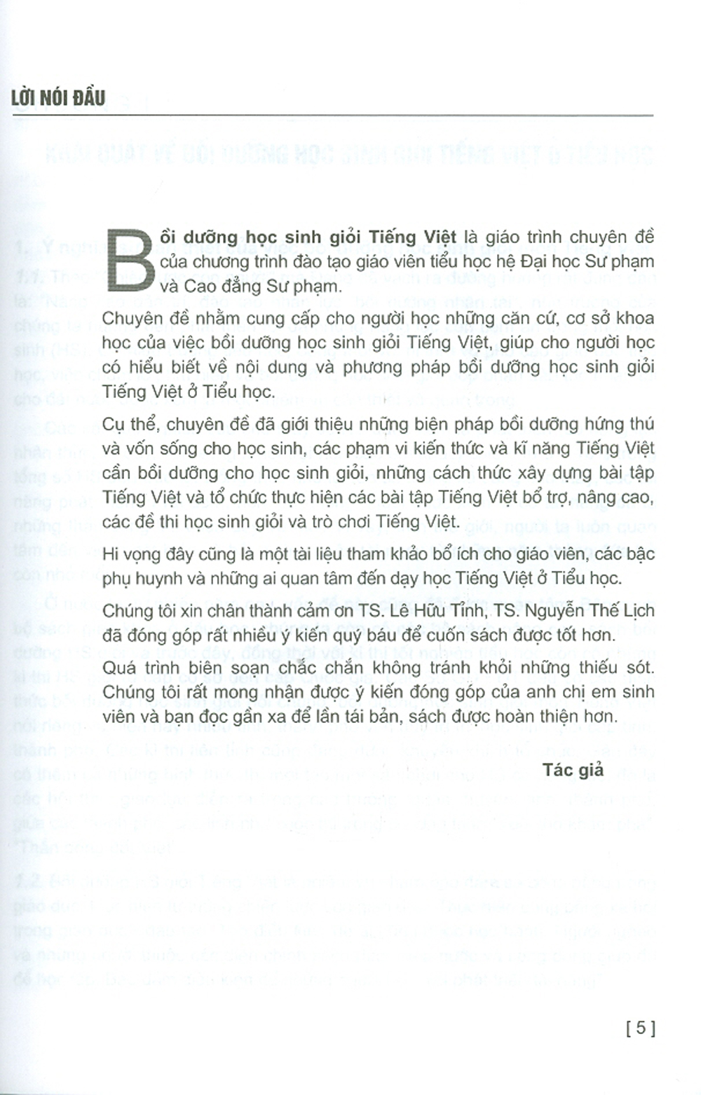 Bồi dưỡng học sinh giỏi Tiếng Việt là giáo trình chuyên đề của chương trình đào tạo giáo viên tiểu học hệ Đại học Sư phạm và Cao đẳng Sư phạm.