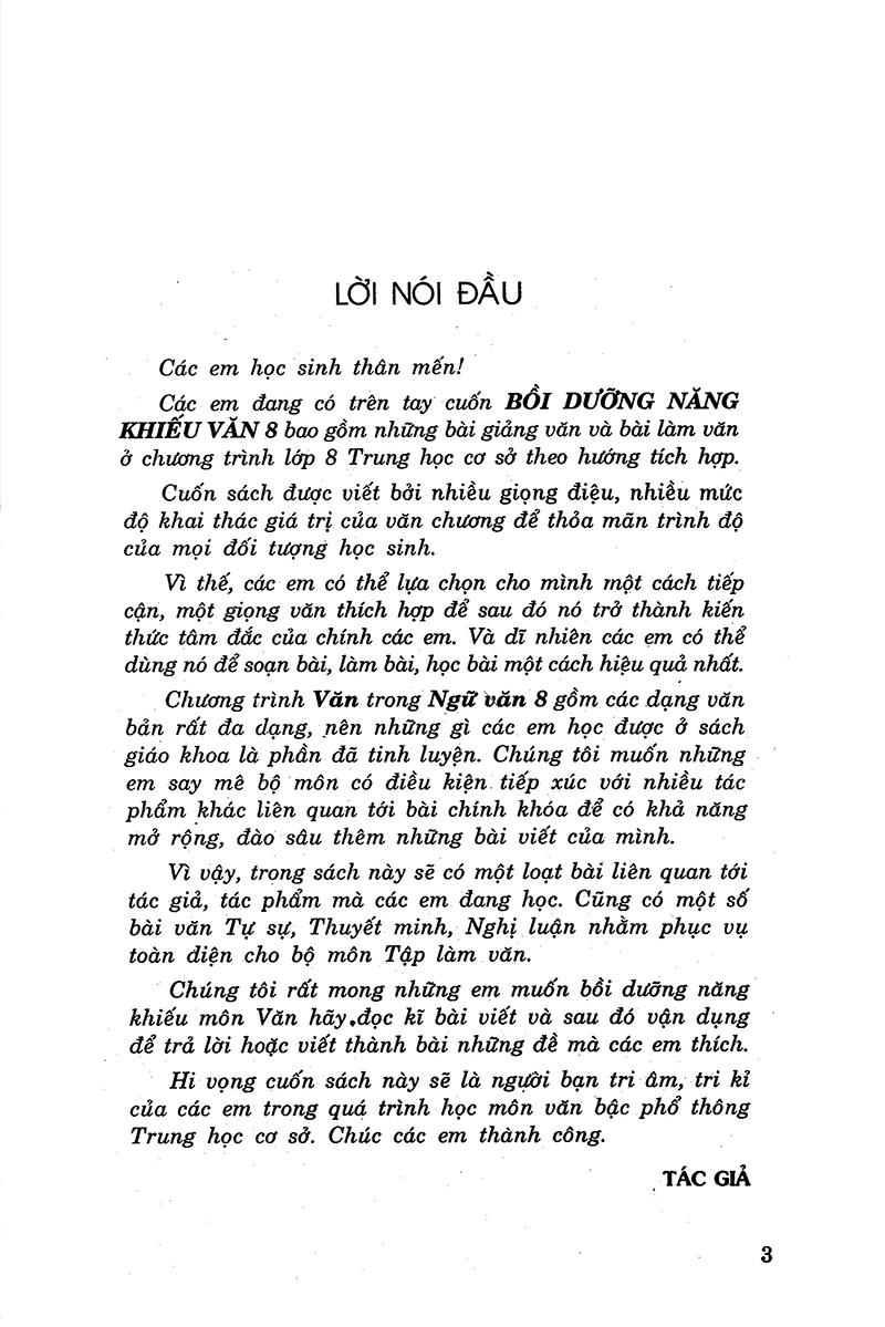 Cuốn sách Bồi Dưỡng Văn Năng Khiếu Lớp 8 gồm những bài giảng văn và bài làm văn ở chương trình lớp 8 THCS theo hướng tích hợp.