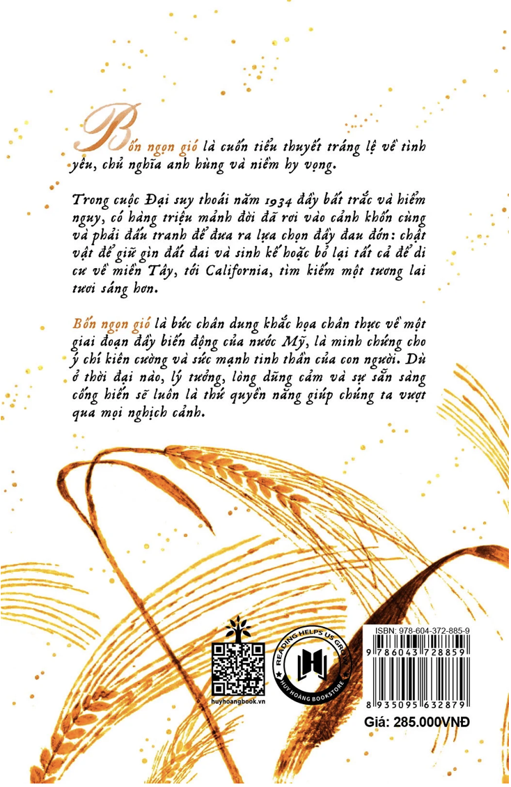 Trong cuộc Đại suy thoái năm 1934 đầy bất trắc và hiểm nguy, có hàng triệu mảnh đời đã rơi vào cảnh khốn cùng. Elsa Martinelli—giống như rất nhiều người hàng xóm của cô—phải đưa ra một lựa chọn đau đớn: chiến đấu cho vùng đất cô yêu hoặc đi về phía tây, tới California, để tìm kiếm một cuộc sống tốt đẹp hơn. BỐN NGỌN GIÓ là một bức chân dung không thể xóa nhòa về nước Mỹ và Giấc mơ Mỹ, được nhìn qua con mắt của một người phụ nữ bất khuất, người có lòng dũng cảm và sự hy sinh sẽ định hình nên một thế hệ.