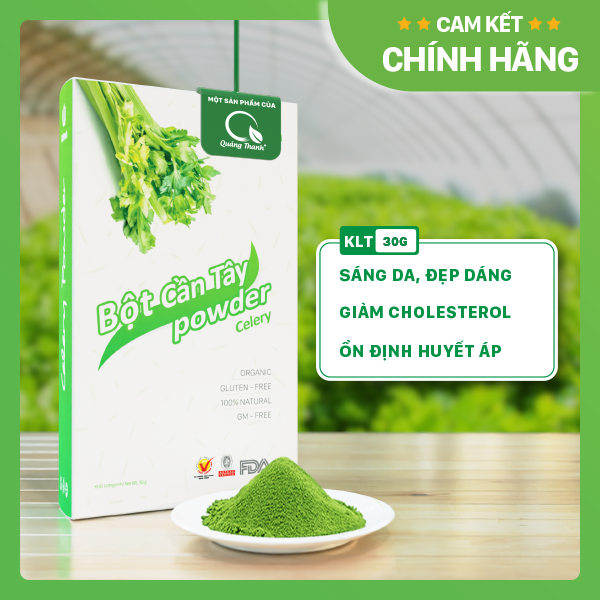 - Mua hàng 1 lần, chăm sóc khách hàng trọn đời. CÔNG DỤNG BỘT CẦN TÂY QUẢNG THANH Cần tây không chỉ là nước uống xu hướng tức thì mà đây là loại thức uống có giá trị dinh dưỡng bền vững, giải quyết các rắc rối thường gặp của cơ thể. Trong cần tây chứa rất nhiều chất dinh dưỡng nên ngoài cung cấp nước, chất xơ cho cơ thể, cần tây còn mang lại rất nhiều lợi ích khác như hỗ trợ ổn định huyết áp, hỗ trợ hệ tiêu hóa, hỗ trợ đẹp da. Còn chờ gì mà không nâng cấp bản thân "Da đẹp dáng xinh" cùng bột cần tây Quảng Thanh Cùng điểm qua 6 công dụng của cần tây: