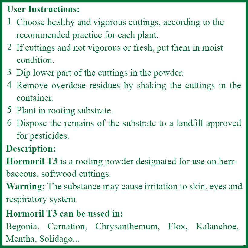 HORMORIL T-3 (bột rễ có chứa thành phần ngăn nấm): T with fungicide cực kỳ quan trọng đối với một số giống cây giâm cành nhạy cảm với vi khuẩn bên ngoài. Vì vậy, tùy loại cây cần giâm cành mà nhà vườn chọn lựa Homoril 3 hay Homoril T3 phù hợp.