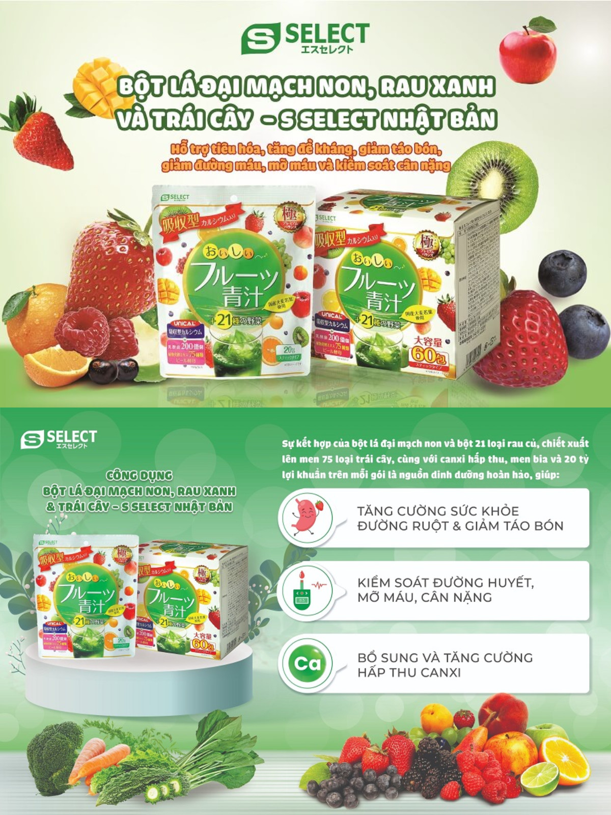 ✨Bột Lá Đại Mạch Non, Rau Xanh Và Trái Cây S Select Yuwa Thải Độc Cơ Thể, Làm Đẹp Da, Chống Lão Hóa
