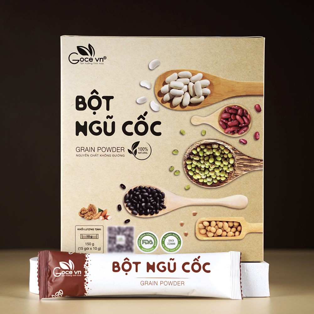 - Khối lượng: 150g (15 gói x 10g). - Thành phần: 100% nguyên chất từ ngũ cốc: Đậu xanh, Đậu nành, Đậu đen, Đậu trắng, Đậu đỏ, Óc chó, Hạnh nhân, Yến mạch, Mè đen, Đậu phộng.
