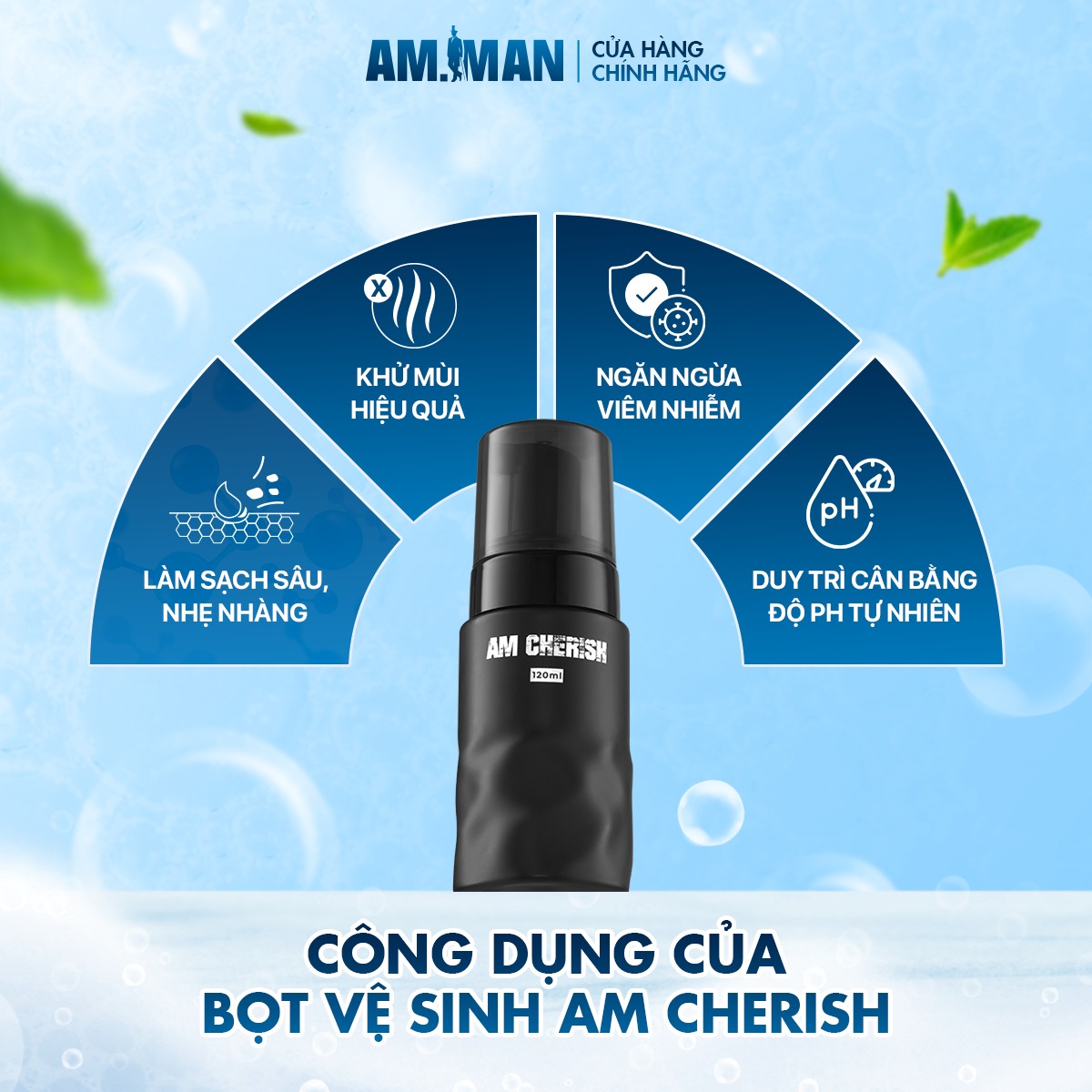 Mua tại TiktokBọt vệ sinh nam AM-MAN AM CHERISH 120ml hương nước hoa cao cấp THÔNG TIN THƯƠNG HIỆU: AM-MAN là thương hiệu chăm sóc cá nhân dành cho Nam Giới đã được cấp phép của Sở Y Tế, tuân thủ đầy đủ các tiêu chuẩn an toàn và mọi thông tin về sản phẩm, nguyên liệu đều được kiểm nghiệm khắt khe và minh bạch. Với danh mục sản phẩm đa dạng, phù hợp với mọi nhu cầu chăm sóc cá nhân khác nhau của phái mạnh, AM-MAN hướng tới sự toàn diện, hiện đại, trẻ trung, năng động giúp mỗi ngày với phái mạnh đều là 1 ngày ý nghĩa. CÔNG DỤNG BỌT VỆ SINH NAM AM CHERISH: