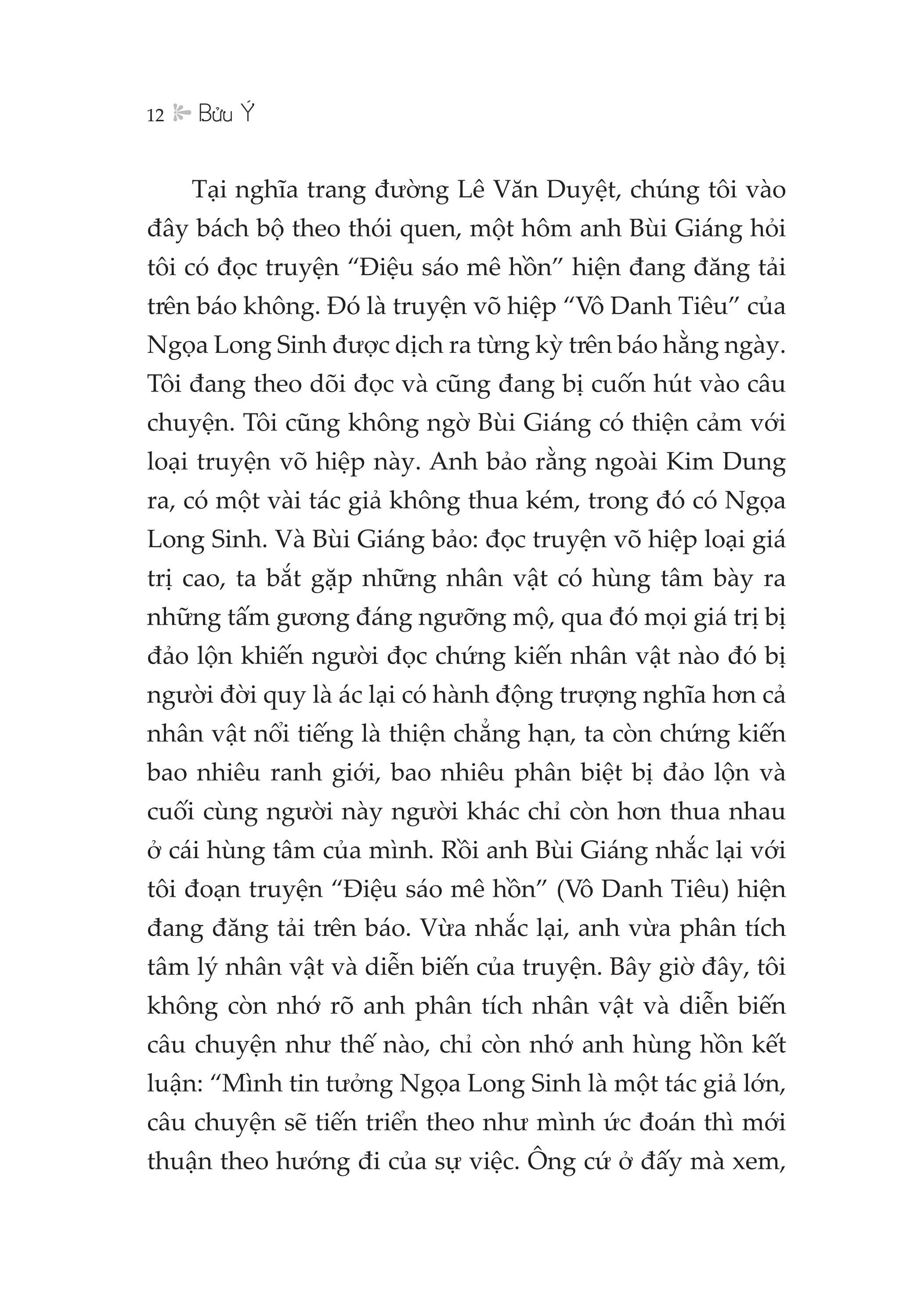 Đây là cuốn sách của nhà văn, dịch giả Bửu Ý, viết về Bùi Giáng, một giọng thơ vô tiền khoáng hậu của văn học Việt Nam thế kỷ XX. Dù viết bao nhiêu về Bùi Giáng, có lẽ cũng là không chính xác hoàn toàn vì ông đã trở thành một hiện tượng, một tượng đài ngôn ngữ, vậy mà qua ngòi bút của Bửu Ý, chúng ta không chỉ thấy Bùi Giáng mà còn thấy cả hơi thở, không khí thời đại mà hai người đã dự phần vào…