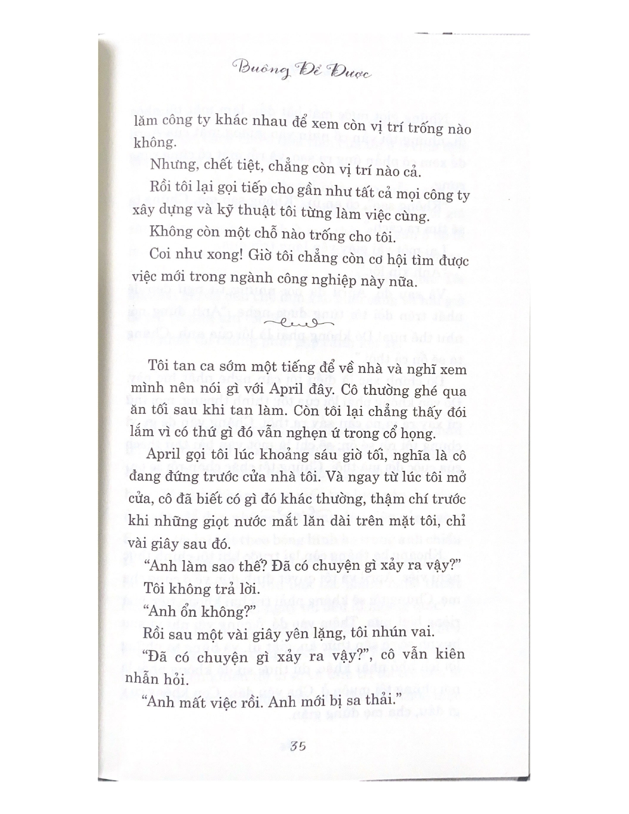 - Giới thiệu sách Buông để được là câu chuyện đầy cảm động của Pat Flynn về cách vượt qua nghịch cảnh để theo đuổi con đường riêng của bản thân. Trong sách, Pat tiết lộ cho người đọc những bài học và trải nghiệm quý giá mà anh đã tích cóp, cũng như những thách thức và cảm xúc mà anh phải đương đầu, trong hành trình trở thành một trong những người đi đầu trong lĩnh vực của mình: kinh doanh trực tuyến và marketing online. Nếu có cùng thôi thúc theo đuổi con đường riêng của mình như Pat, bạn sẽ thấy thích thú khi đọc Buông để được. Xét cho cùng, nếu muốn mở khóa tiềm năng đích thực của bản thân, tất cả chúng ta đều phải đối mặt với một ý tưởng vô cùng táo bạo và mạo hiểm: buông để được. Lời bình “Buông để được đã giúp tôi lấy lại niềm tin và tự mình tháo gỡ những “xiềng xích” đang kiềm hãm bản thân. Tôi vẫn cần phải học thêm nhiều nhưng Pat đã dạy tôi cách buông bỏ và hành động. Nếu mua cuốn sách này, bạn cũng sẽ được anh ấy truyền cảm hứng.” - Ryan, độc giả “Cuốn sách tuyệt vời này đã gây ấn tượng sâu đậm với vợ chồng tôi. Chúng tôi vừa nghỉ việc và chuyển nhà cùng với đứa con bốn tháng tuổi. Tôi đã quyết định thực hiện bước nhảy này, phần lớn là nhờ vào sự tự tin mà Pat đã truyền cho mình.” - Aaron, độc giả “Dù kết quả là thành công hay thất bại, tôi vẫn hài lòng với lựa chọn của chính mình.” - Pat Flynn