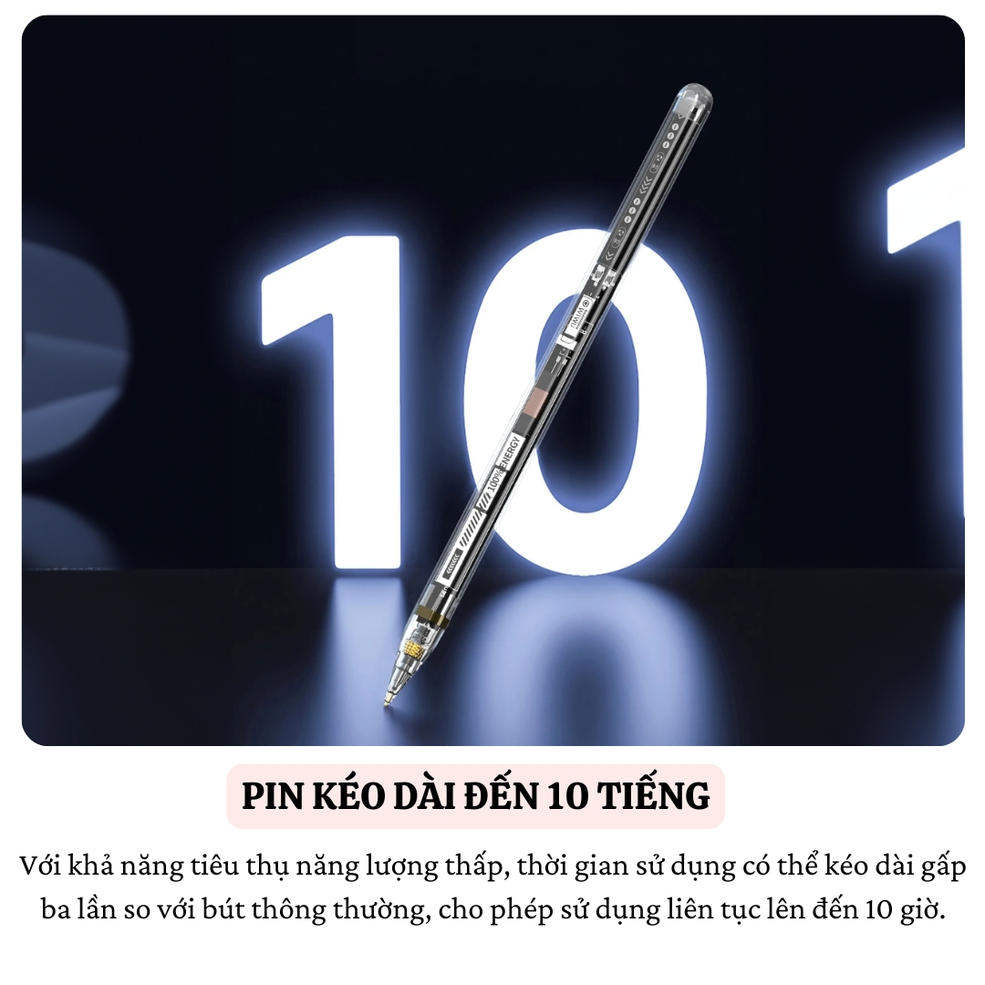 - Với pin 100mAh, bút có thể hoạt động liên tục lên đến 10 giờ, thời gian chờ lên đến 90 ngày, luôn sẵn sàng phục vụ mọi nhu cầu của bạn.