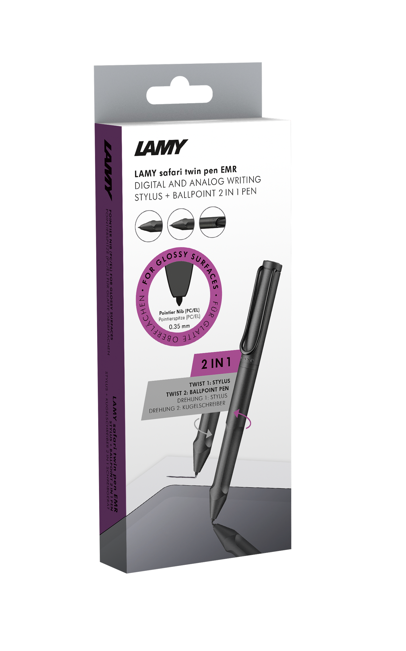 Dựa trên thiết kế LAMY safari twin pen, cây bút 2 trong 1 này được phát triển để sử dụng linh hoạt trên cả phương tiện kỹ thuật số (máy tính bảng, điện thoại thông minh, máy tính xách tay) và trên giấy. Bao gồm 1 ngòi bút điện tử và 1 ngòi bút bi giúp người dùng sử dụng linh hoạt hơn.