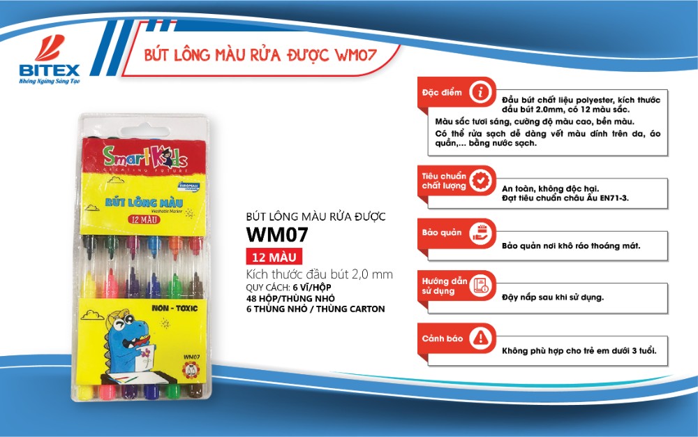 - Bút lông màu rửa được SK-FLT1001CL của Smartkids (12 màu) được sản xuất theo tiêu chuẩn chất lượng châu Âu EN 71 (1,2,3) và ASTM D4236. Nhờ sở hữu đầu lông kim được thiết kế đặc