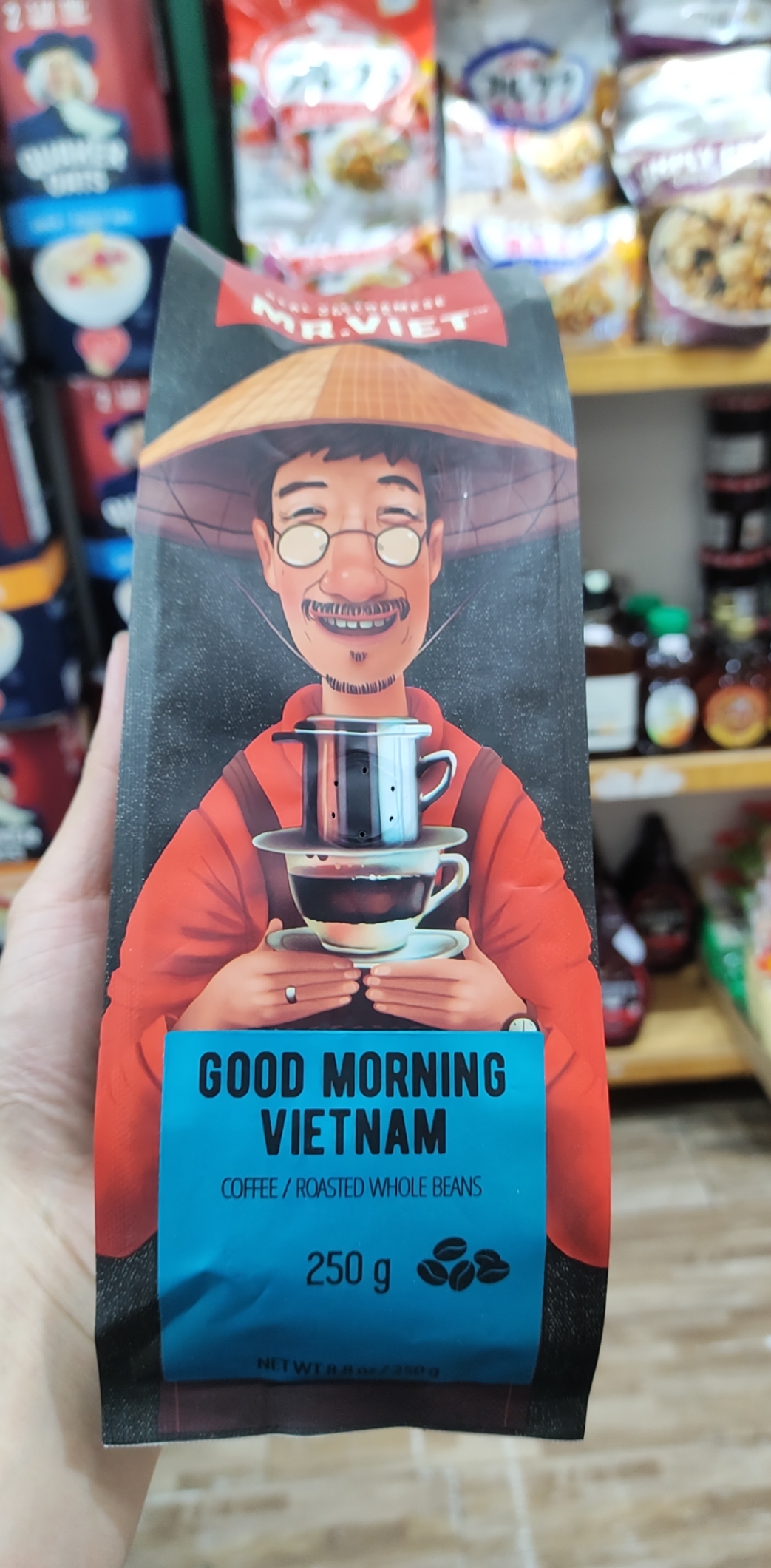 Cà phê hạt rang Good Morning Mr Viet 250g - Xuất xứ: Việt Nam - Thương hiệu: Mr Viet - HSD: 24 tháng kể từ ngày sản xuất - Thành phần: 100% cà phê tự