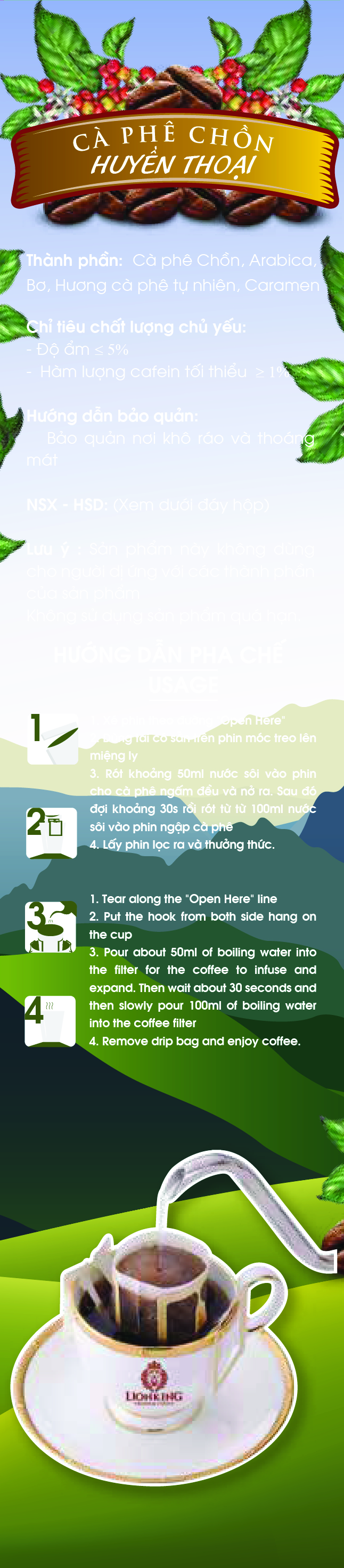 Thành phần / Ingredients: 100% Robusta. Hương vị / Flavor: Đắng đậm, sôcôla, mùi thuốc lá và hậu vị ngọt / Bold, chocolate, cigarette flavor and sweet after-taste. úi 500g / Bag 500gQuy cách / Type: