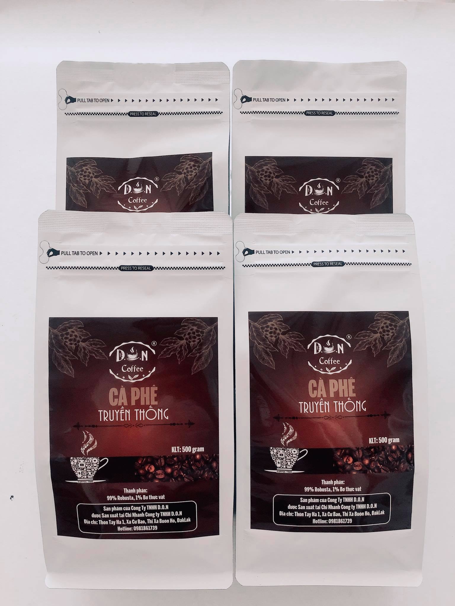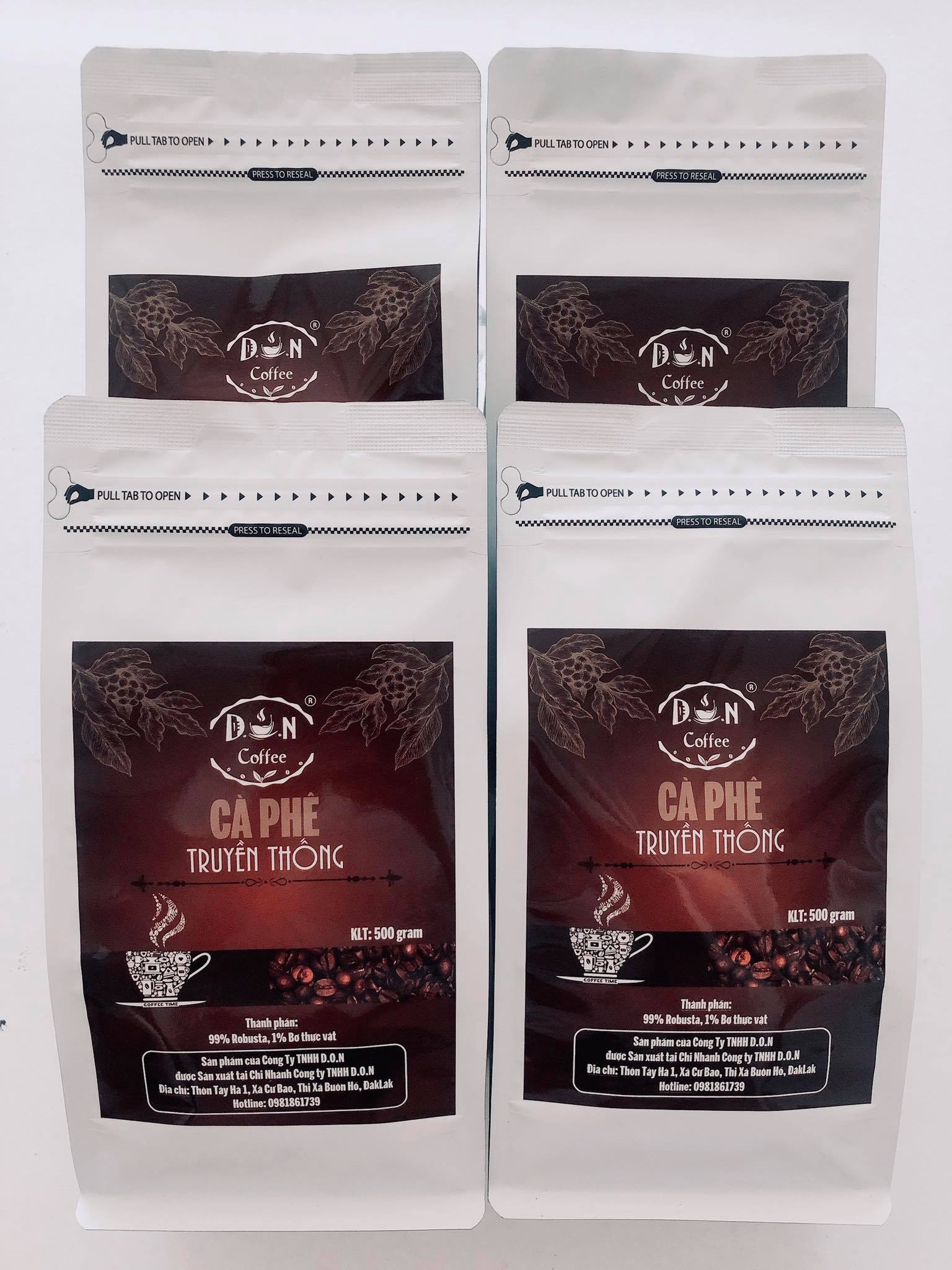 - Hạn sử dụng: 12 tháng. CÀ PHÊ RANG XAY D.O.N COFFEE TRUYỀN THỐNG 500gram (Bột) sở hữu hương thơm nồng nàn, khẩu vị đắng, đậm đà phù hợp với GU của người Viêt, có tính tiện dụng cao, thích hợp sử dụng tại nhà, quán cà phê, văn phòng, khách sạn. Nguyên liệu tạo nên sản phẩm được lựa chọn kĩ càng từ những vườn cà phê chất lượng trên Cao Nguyên Đăk lăk . Quy trình chế biến khép kín, đảm bảo vệ sinh an toàn thực phẩm, không gây hại đến sức khỏe người tiêu dùng