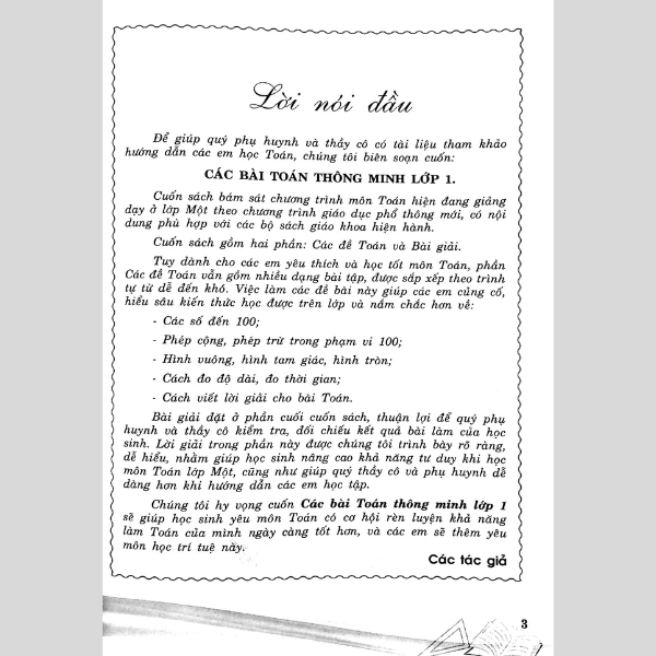 Chúng tôi hy vọng cuốn Các bài Toán thông minh lớp 1 sẽ giúp học sinh yêu môn Toán có cơ hội rèn luyện khả năng làm Toán của mình ngày càng tốt hơn, và các em sẽ thêm yếu môn học trí tuệ này.