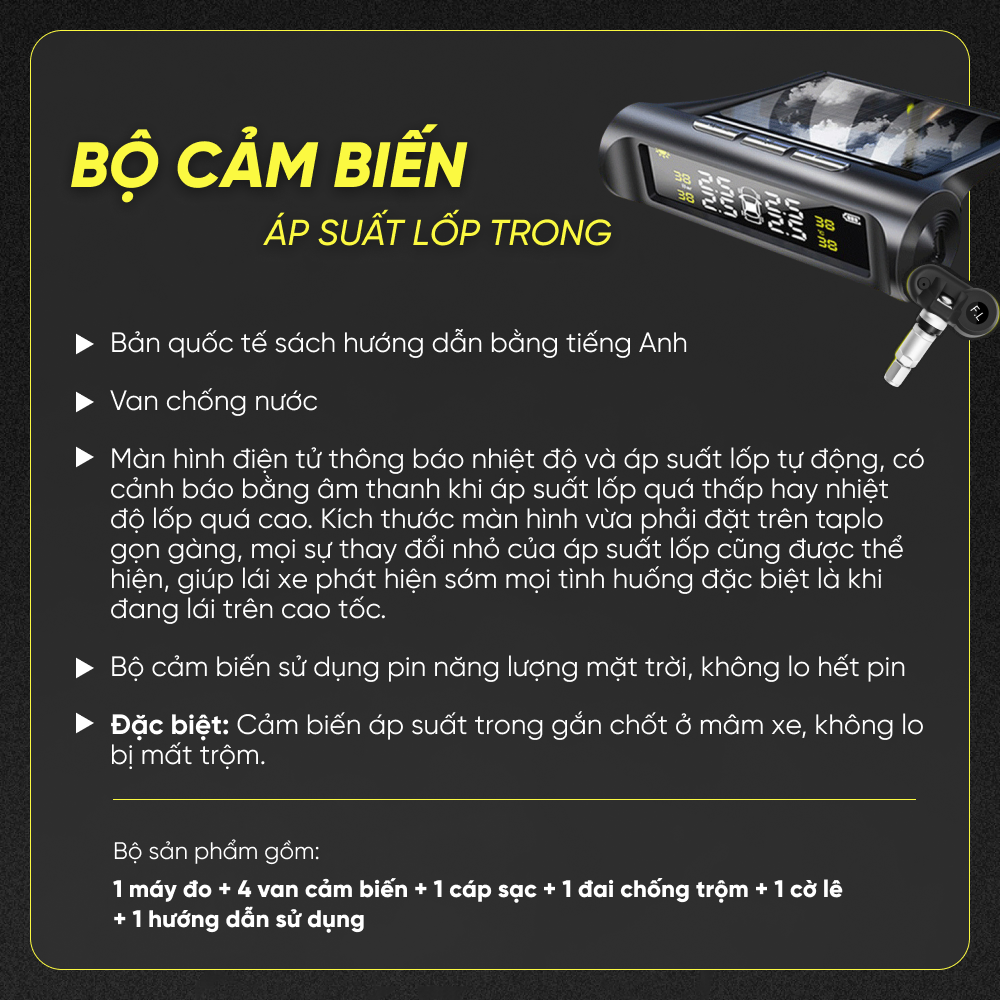 Kiểm soát các vấn đề về lốp luôn được người sử dụng ô tô quan tâm hàng đầu. Còn gì tuyệt vời hơn khi bạn chỉ việc ngồi trong xe mà vẫn hoàn toàn có thể kiểm soát được áp suất và nhiệt độ từng lốp xe của mình mà không phải trực tiếp ra ngoài tận mắt kiểm tra nữa! Được sản xuất trên công nghệ tiên tiến nhất , Cảm biến áp suất lốp ô tô TPMS màn hình led màu thông minh theo dõi từng thay đổi nhỏ nhất của nhiệt độ và áp suất lốp, có cảnh báo bằng âm thanh và hình ảnh tới bạn mỗi khi áp suất lốp quá thấp 3,3 Bar hoặc nhiệt độ lốp > 70 độ C.