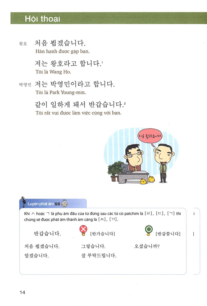 Tiếng Hàn Tổng Hợp Dành Cho Người Việt Nam - Sơ Cấp 1 Trong những năm gần đây, nhu cầu học tiếng Hàn và tìm hiểu về văn hóa Hàn Quốc đang có xu hướng tăng lên. Người học tiếng Hàn rất mong muốn có được một bộ giáo trình chuẩn, được biên soạn một cách tỉ mỉ và hữu ích nhất. Giáo trình tiếng Hàn tổng hợp lần đầu tiên được trao bản quyền chính thức tại Việt Nam Hiểu được điều đó, ngày 4-7, Đại diện chính phủ Hàn Quốc, ngài Woo Hyeong Min – Trưởng đại diện Văn phòng Quỹ giao lưu Quốc tế HQ tại Việt Nam cùng GS.TS.NGƯT Mai Ngọc Chừ – Chủ tịch Hội Nghiên cứu khoa học về Hàn Quốc của Việt Nam (KRAV) đã trao quyết định cho phép Công ty Cổ phần sách MCBooks của Việt Nam được xuất bản cuốn sách này tại thị trường Việt Nam. Và đây chính là bộ giáo trình tiếng Hàn tổng hợp đầu tiên có bản quyền chính thức có mặt tại Việt Nam. Cũng theo ông Woo Hyeong Min, Thực tế đây là bộ giáo trình chính thống mà tất cả người học tiếng Hàn tại Việt Nam cần sử dụng. Tuy nhiên nhiều năm qua bộ sách đến tay người dùng đều là sách lậu nên chưa đạt được kết quả mà chính phủ Hàn muốn mang tới Việt Nam. Do đó Chính phủ Hàn Quốc đã quyết định tìm 1 đơn vị xuất bản uy tín của Việt Nam để giúp họ mang đến cho người học những cuốn sách tiếng Hàn chất lượng tốt với giá cả hợp lý. Bộ giáo trình được Hội nghiên cứu khoa học Hàn Quốc của Việt Nam biên soạn và hiệu đính. Bộ giáo trình sẽ giúp nâng cao hiệu quả trong việc sử dụng ngôn ngữ Hàn sau tiếng mẹ đẻ và tiếng Anh, là nền tảng giúp người lao động Việt Nam nhận được những vị trí làm việc cao trong doanh nghiệp Hàn Quốc. Đây cũng là cách để thúc đẩy quan hệ hợp tác về văn hoá và giáo dục giữa hai nước trong thời gian tới. Giới thiệu cuốn Giáo trình tiếng Hàn tổng hợp dành cho người Việt Nam – Sơ cấp 1 Giáo trình tiếng Hàn tổng hợp dành cho người Việt Nam – Sơ cấp 1 được biên soạn dành cho người Việt Nam muốn học tiếng Hàn ở trình độ sơ cấp. Sách được biên soạn nhằm hướng tới việc sử dụng được trong các tiết học tiếng Hàn tại giảng đường đại học nên mỗi bài học được chia thành nhiều phần như: Lý thuyết cơ bản gồm từ vựng và cấu trúc ngữ pháp; phần luyện tập theo 4 kỹ năng giao tiếp như: Nghe – Nói – Đọc – Viết, phần luyện phát âm, phần tìm hiểu văn hóa… Các chủ đề trong sách được sắp xếp một cách có hệ thống và liên quan chặt chẽ với nhau. Giáo trình tiếng Hàn tổng hợp được biên soạn kèm theo một cuốn sách bài tập hỗ trợ giúp người học ôn tập kỹ hơn và có thể luyện tập nâng cao trong những trường hợp cần thiết. Nội dung trong Giáo trình tiếng Hàn tổng hợp – Sơ cấp 1 2 cuốn sách trong bộ Sơ cấp được xây dựng với 30 bài khóa và bảng chữ cái. Trong đó quyển 1 gồm phần bảng chữ cái và 15 bài đầu. Học hết quyển 1, bạn sẽ học đến quyển sơ cấp 2 với 15 bài còn lại. Cấu trúc tổng thể của giáo trình được xây dựng theo các chủ đề; mỗi chủ đề được liên kết thống nhất với một hệ thống các từ vựng và cấu trúc ngữ pháp cơ bản, bài tập ứng dụng, kỹ năng và tìm hiểu văn hóa. Trong mỗi bài học, nội dung học được chia thành các phần như: luyện từ vựng, luyện ngữ pháp cơ bản, luyện tập kỹ năng nghe – nói – đọc – viết, luyện phát âm, tìm hiểu văn hóa của đất nước Hàn Quốc xinh đẹp. Và kết thúc mỗi bài đều có thêm bảng từ mới xuất hiện trong bài học. Phần cuối của sách, các tác giả đưa ra hệ thống từ mới được sắp xếp theo thứ tự của bảng chữ cái. Đây là những từ không xuất hiện trong phần ngữ pháp, từ vựng cơ bản; nhưng lại xuất hiện nhiều ở phần luyện tập của từng bài.