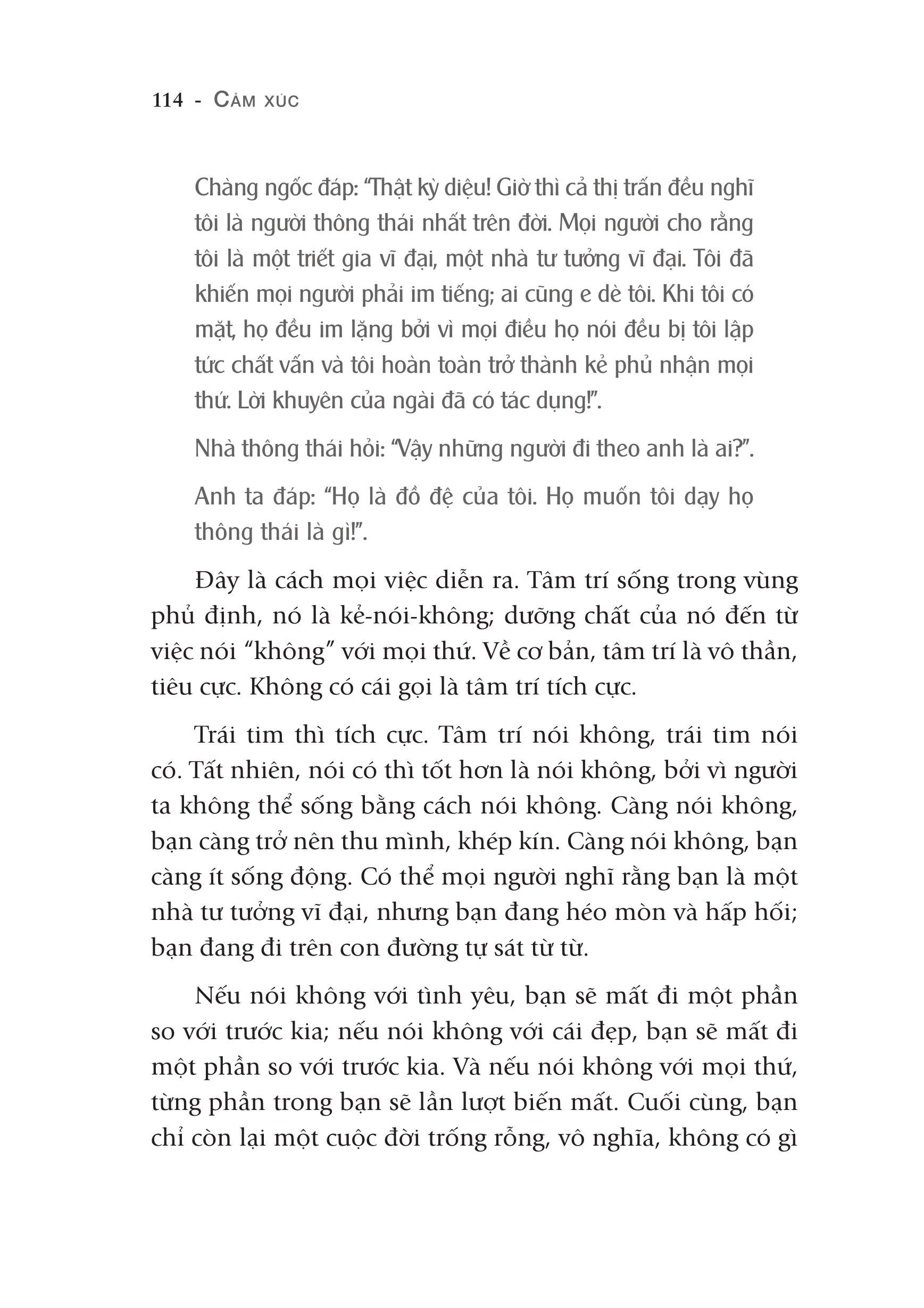 Osho tin rằng chỉ khi nào ta chấp nhận toàn bộ cảm xúc của bản thân một cách trọn vẹn, khi đó cuộc sống của ta mới thực sự lành mạnh, bởi “một người không biết tức giận sẽ không biết yêu thương”. Nếu ngay cả bạn cũng chối bỏ những cảm xúc của mình thì ai sẽ đón nhận chúng? Không ai cả! Chúng sẽ tiếp tục bị đẩy vào góc khuất và con người bạn lại kém trọn vẹn đi một chút. Hãy phá vỡ vòng lẩn quẩn tai hại đó bằng cách chấp nhận cảm xúc của bản thân, như Osho đã nói: “Việc cần làm không phải là kìm nén hay hủy diệt, mà là bạn phải học cách hòa hợp các nguồn năng lượng của mình”.