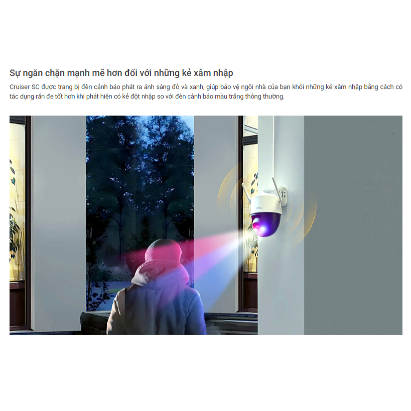 – Cảnh báo chủ động: bật còi hú và đèn chớp xanh đỏ khi phát hiện có đối tượng xâm nhập.