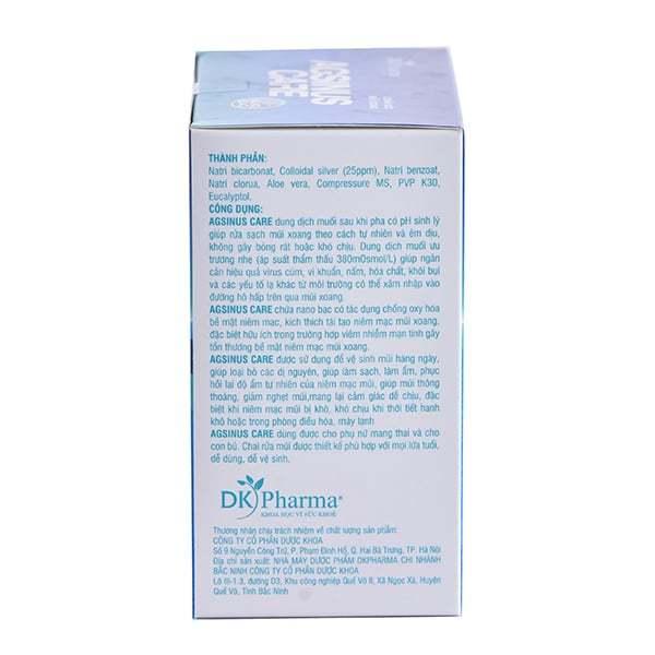 - Muối Nano Bạc Agsinus Care chứa Colloidal Silver có khả năng diệt vi khuẩn trong 3 giây, chống viêm và làm nhẹ dịu khoang mũi, cải thiện tình trạng nghẹt mũi, nhức mũi,...