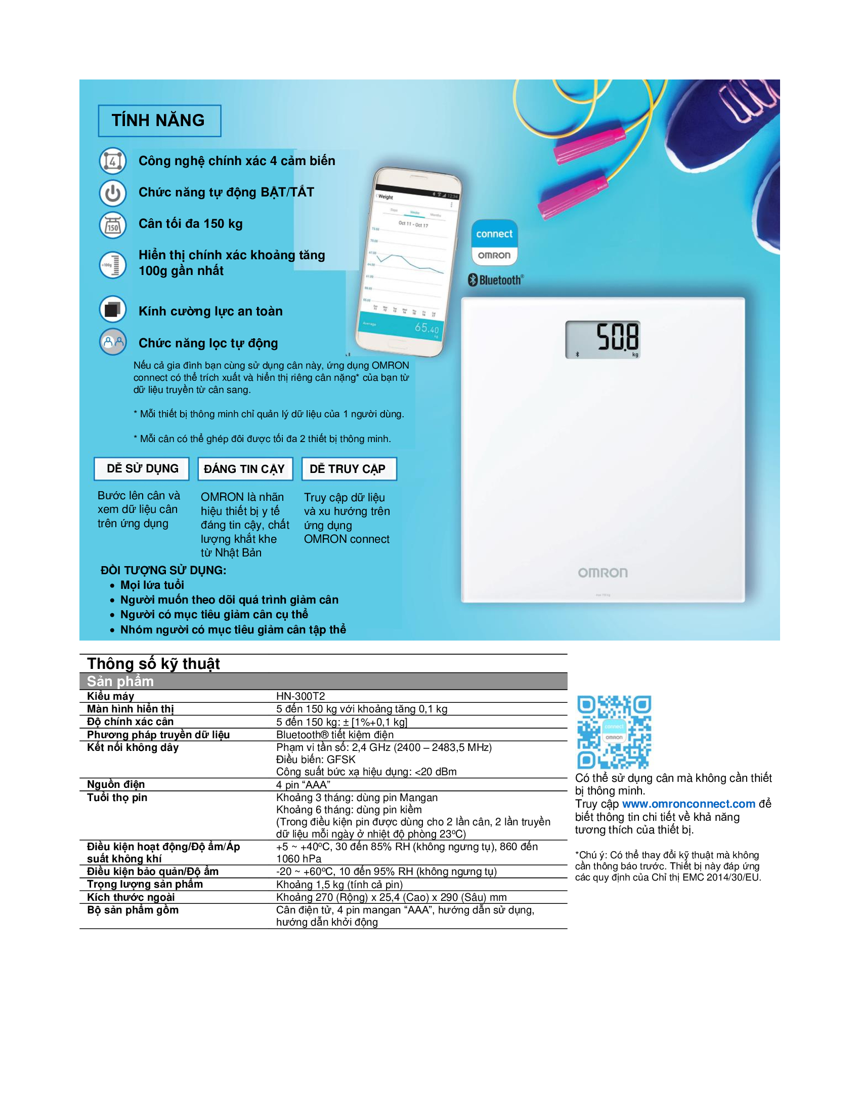 - Cân sức khỏe điện tử Omron HN_300T2 đơn giản và chính xác, chuyển các kết quả của bạn với kết nối Bluetooth sang ứng dụng OMRON connect dễ dàng cho gia đình bạn.