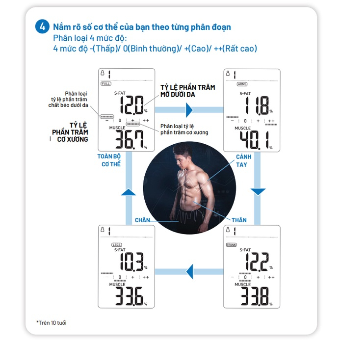 - Cân có chức năng phân đoạn mỡ dưới da & tỷ lệ phần trăm cơ xương