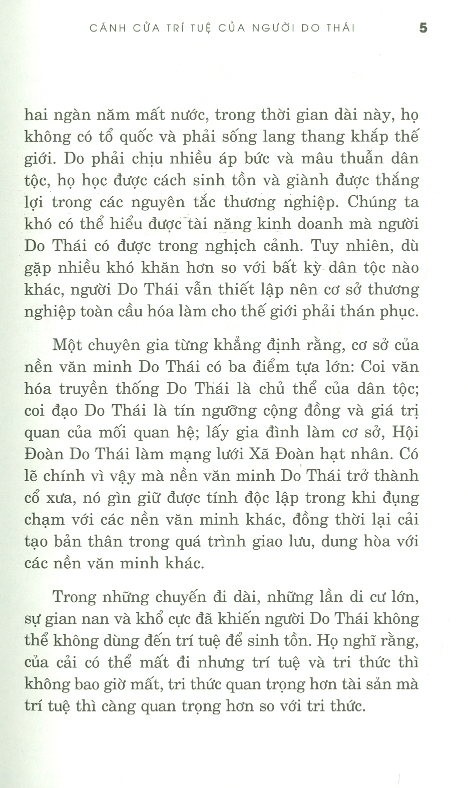 Đấu tranh sinh tồn, cách ứng xử trong cuộc sống, sinh hoạt, học tập, kinh doanh của dân tộc Do Thái chính là những bí quyết đưa đến thành công mà bạn đọc có thể tìm thấy trong Cánh cửa trí tuệ của người Do Thái. Đó là những kinh nghiệm sống thiết thực, vô cùng hữu ích đối với chúng ta: từ phương pháp giáo dục con cái, cách ứng xử trong cuộc sống, cho đến bí quyết kinh doanh thành đạt… Tất cả đều là những chiếc chìa khóa thần kỳ mở ra cánh cửa của tri thức và niềm tin khi bước vào cuộc sống.