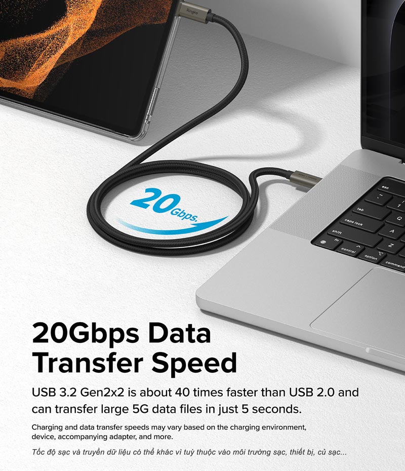 Cáp sạc nhanh 240W RINGKE USB-3.2 Gen 2X2 USB-C Cable Ưu điểm sản phẩm Truyền dữ liệu và sạc nhanh Cáp Ringke USB 3.2 Gen 2X2 USB-C Cable cung cấp giải pháp kết nối đồng bộ dữ liệu giữa các thiết bị có cổng kết nối chuẩn USB-C với tốc độ truyền tải tối đa 20Gbps, truyền phim HD hoặc các tập tin lớn chỉ trong vài giây. Cáp Ringke USB 3.2 Gen 2X2 USB-C Cable hỗ trợ công nghệ PD 3.1 (Power Delivery), cho phép sạc nhanh các thiết bị tương thích với công suất lên đến 240W. Bạn có thể sạc nhanh cho laptop, điện thoại di động, máy tính bảng và các thiết bị khác hoặc truyền tải dữ liệu nhanh chóng.