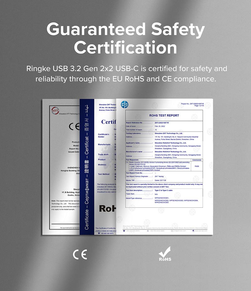 • Cáp này có chứng nhận USB-IF không? => Cáp Ringke USB 3.2 Gen 2X2 USB-C không có chứng nhận USB-IF tuy nhiên sản phẩm được đảm bảo độ tin cậy và an toàn theo tiêu chuẩn RoHS và CE.