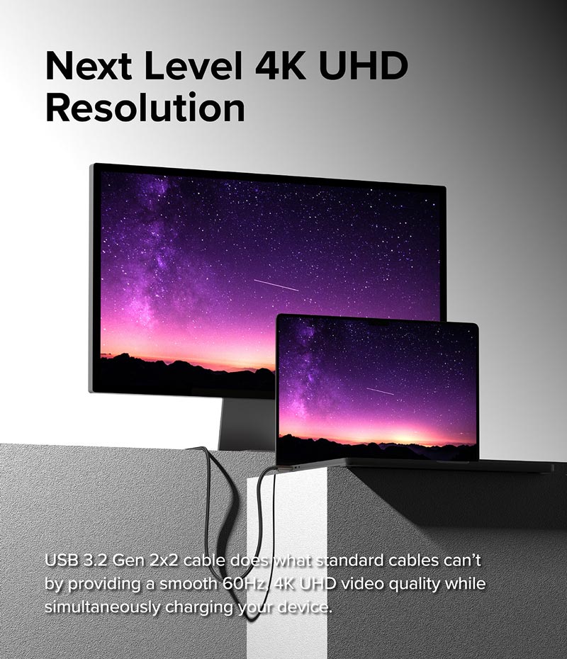 Kết Nối TV Truyền Video 4K  Cáp Ringke USB 3.2 Gen 2X2 USB-C Cable hỗ trợ cổng kết nối Thunderbolt 3, cáp sạc nhanh này cho phép bạn kết nối MacBook với màn hình thứ hai như tivi, máy chiếu, màn hình với khả năng hiên thị hình ảnh video độ phân giải cao hỗ trợ lên đến 4K@60Hz.