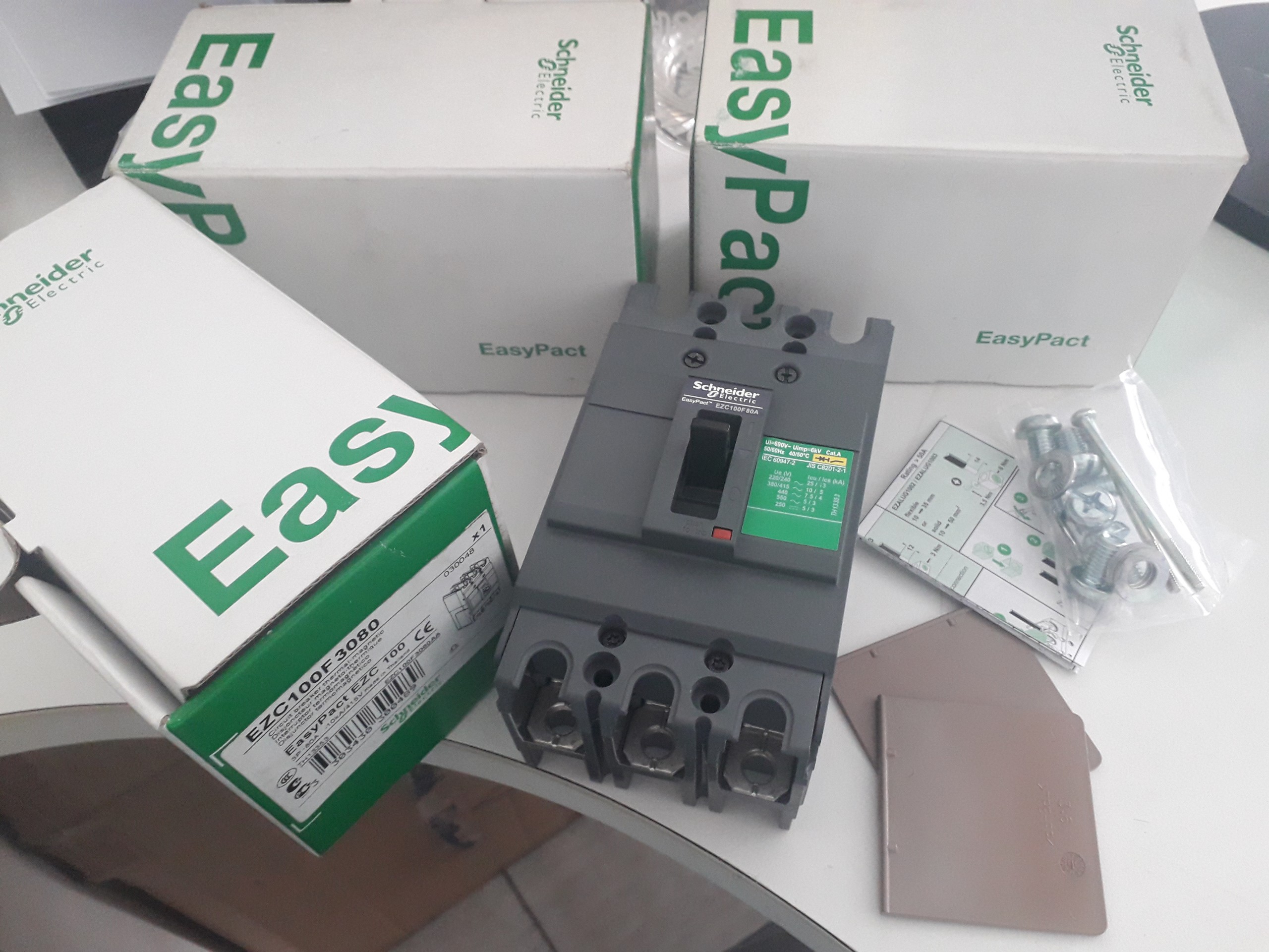 Schneider Easypact CVS100F 3P 80A: Aptomat 3P 80A, Icu 36kA, Ics 36kA IEC 60947-2 Ampere frame (AF) 100A (Khung kích thước chế tạo) Rated current(A) (0.7-1)*80A-100A (dòng điện định mức) Ultimate breaking capacity(kA), Icu 36kA