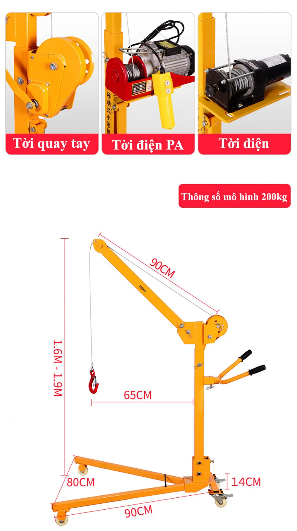Thông số kĩ thuật: Trọng lượng: 38 kg Trọng Tải: 200 kg Cao: 185 cm Càng vươn: 108 cm Chiều dài cần: 105 cm Khe mở càng: 82cm Độ dài cáp: 3.5m Kích cỡ cáp: phi 4 Độ dày hộp: 3mm