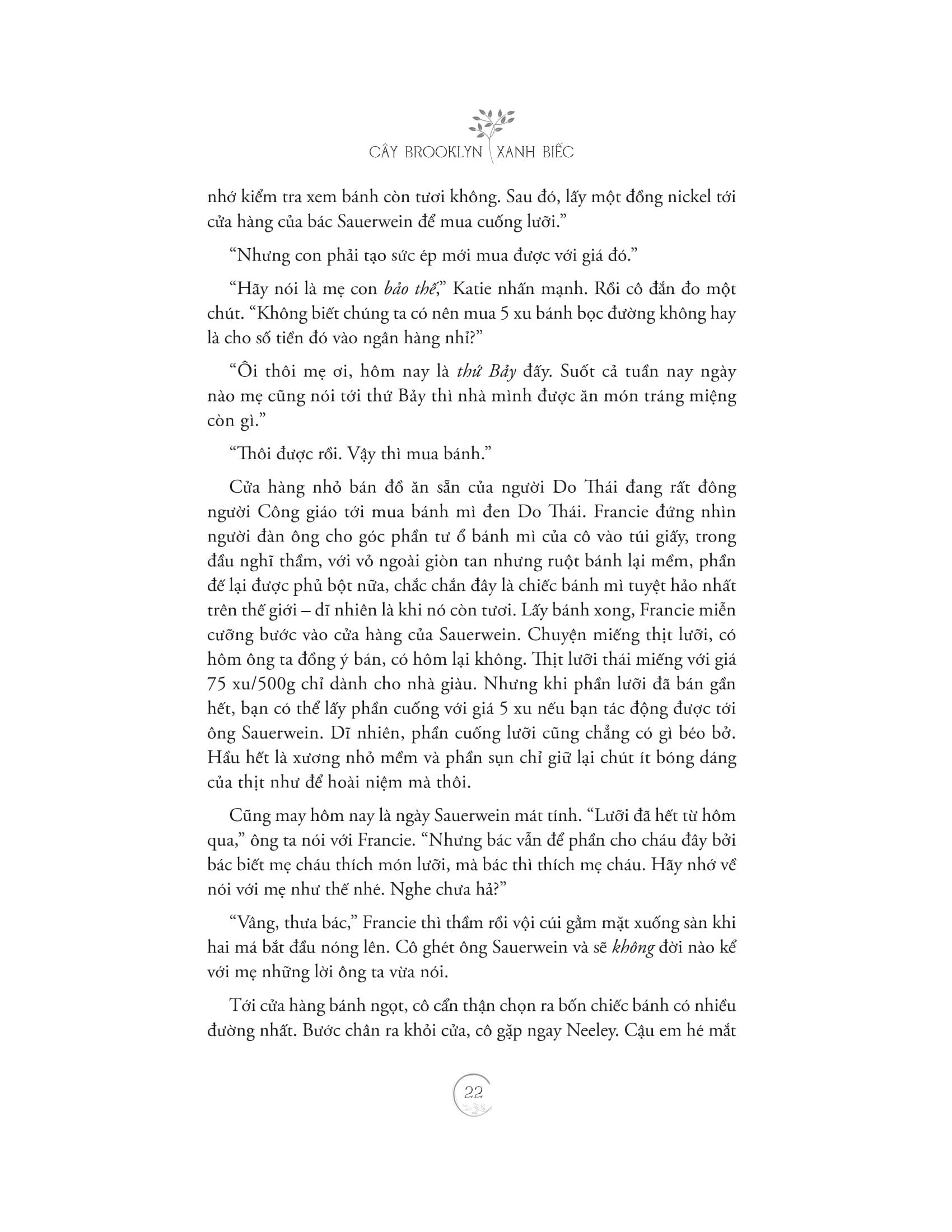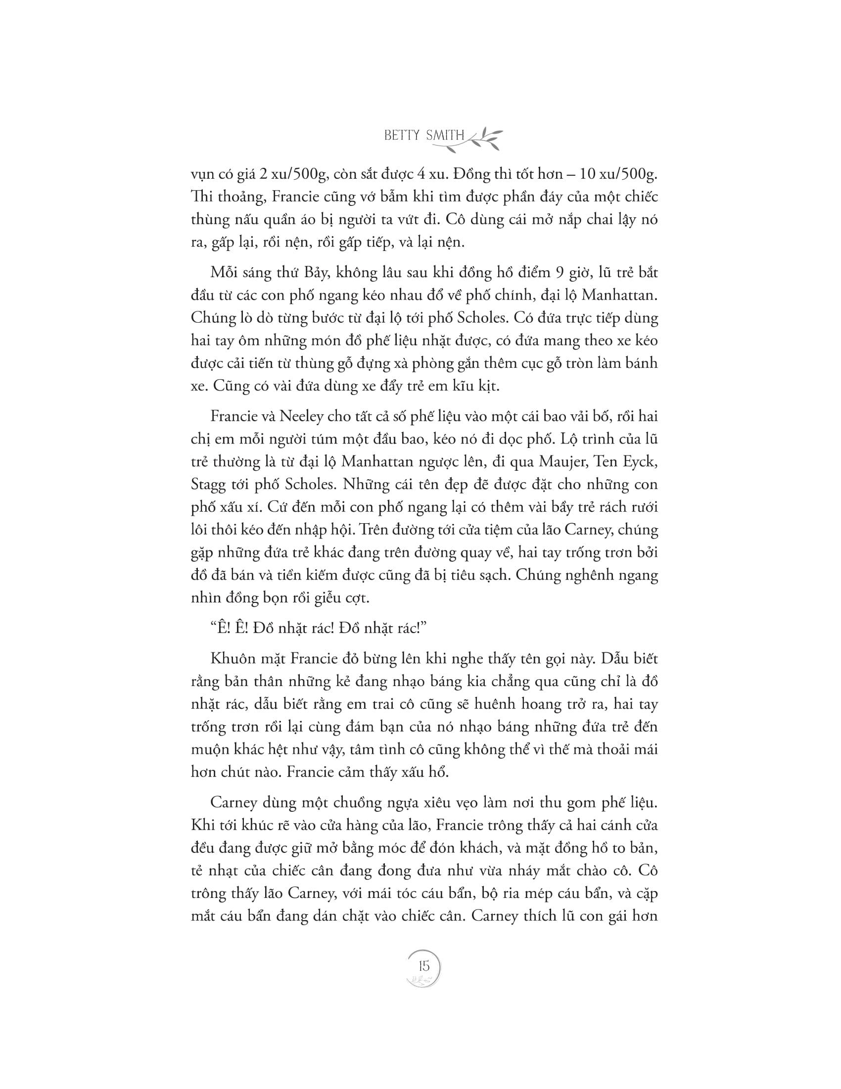 Ngay từ khi chập chững bước chân đến thế giới, Francie Nolan đã được định sẵn sẽ phải trở thành một thiếu nữ cứng rắn, bởi vì lớn lên trong khu ổ chuột Williamsburg ở Brooklyn, New York đòi hỏi con người ta phải luôn dũng cảm, khôn ngoan và mạnh mẽ. Thường bị hàng xóm khinh miệt vì những hành vi thất thường và lập dị của gia đình mình – chẳng hạn như bố cô, Johnny thích rượu và dì Sissy liên tục kết hôn nối tiếp nhau mà không ly hôn với chồng trước – không ai, kể cả là Francie, có thể nói rằng cuộc sống của gia đình Nolan thiếu kịch tính. Với những bước ngoặt choáng ngợp, đau lòng nhưng cũng đầy thăng hoa, những trải nghiệm hằng ngày của gia đình Nolan hiện lên chân thật, nguyên bản và là mối dây dịu dàng buộc những thành viên trong gia đình lại với nhau.