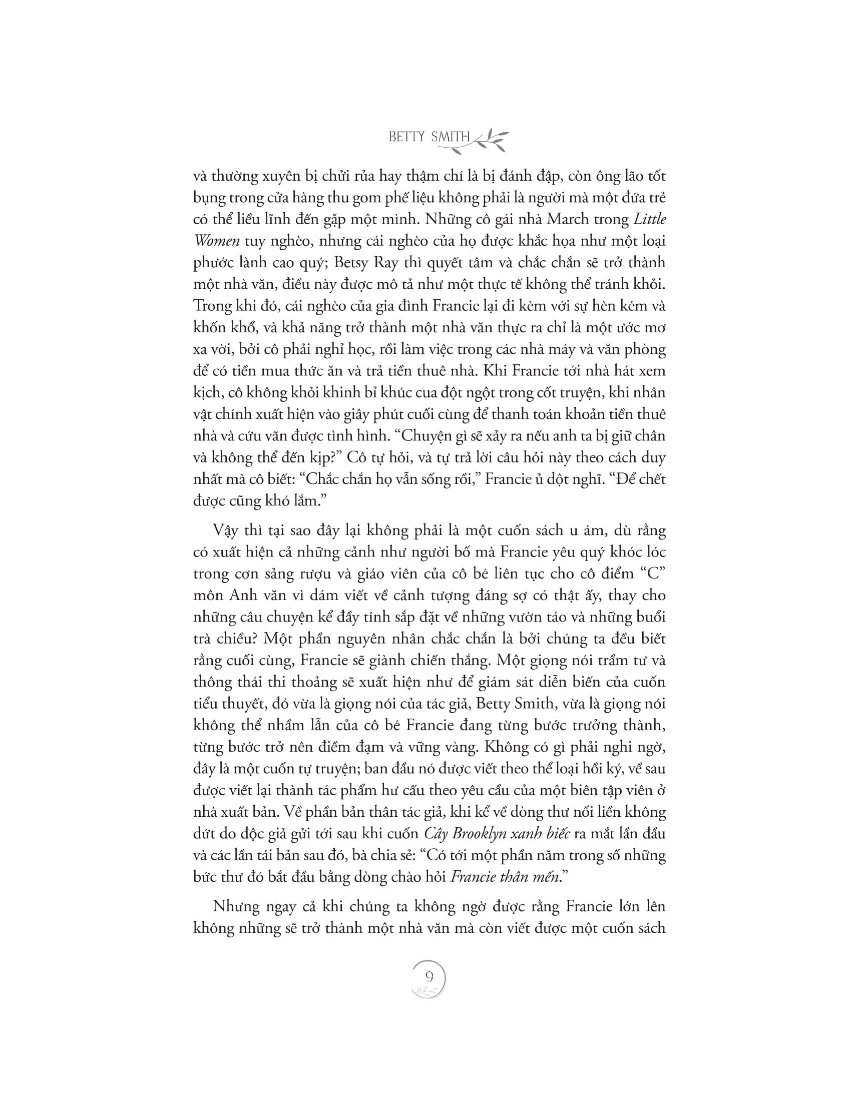 Betty Smith (1896-1972) là một tiểu thuyết gia người Mỹ. Bà sinh ra trong một gia đình người Đức nhập cư, lớn lên trong cảnh nghèo khó ở Williamsburg, New York. Những trải nghiệm tuổi thơ khốn khó là chất liệu để bà viết lên cuốn tiểu thuyết đầu tay Cây Brooklyn xanh biếc – một áng văn chương xuất sắc và lay động lòng người. Các tác phẩm của bà đề cập tới những chủ đề về giới hạn của sự vật hữu hình và tưởng tượng, các cực giới tính, và đặc điểm giới tính.