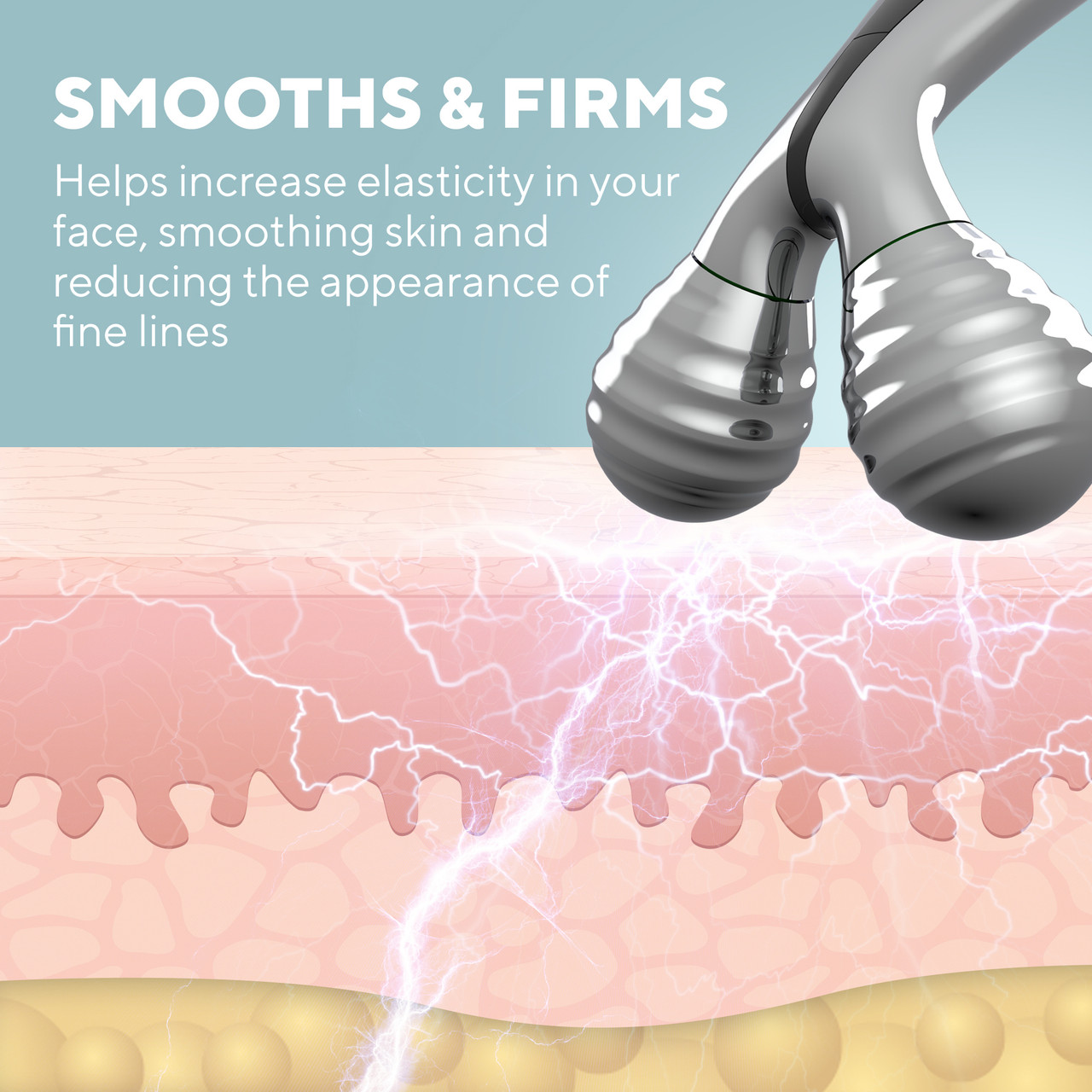 Các con lăn xoay 360° với công nghệ dòng điện siêu nhỏ dễ dàng lướt trên da, tái tạo quá trình massage chuyên nghiệp giúp phục hồi và làm săn chắc da. Lý tưởng để giảm căng thẳng ở cổ và cánh tay.