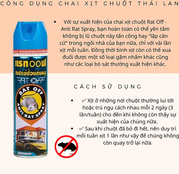 Xịt đuổi chuột Rat OffXịt đuổi chuột Thái Lan Rat-Off đuổi sạch chuột, tiêu diệt chuột sau 1 tuần xịt. Hàng khan hiếm, đặc biệt thích hợp cho khu nhà nhiều chuột, ngõ ngách, hàng quán ăn, khoang máy ô tô bị chuột gậm nhấm dây điện,.
