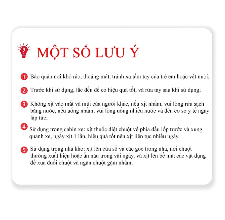Có thể đuổi chuột trong nhà bếp, trên trần nhà, ngăn kéo, tủ, -Chuột là loại thuốc xịt chuột đã được đăng ký bởi Cục kiểm soát các chất độc hại Bộ y tế Thailand - Xịt Chuột được chiết xuất từ các chất tự nhiên 100% thuốc trừ sâu, không độc hại, chất lượng và an toàn