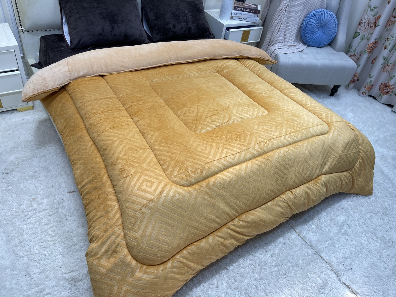 Size Queen 248x233cm chuẩn Âu – rộng rãi, ôm trọn giấc ngủ. • Trọng lượng ~2.2kg – siêu nhẹ, siêu êm, cực ấm. • Bề mặt nhung mịn, dày, không bám lông – chạm vào
