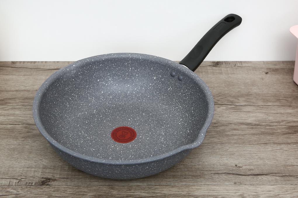 Ở giữa lòng chảo chống dính Tefal có biểu tượng đồng hồ cát, khi biểu tượng này chuyển sang màu đỏ sẫm, chảo đã đạt nhiệt độ lý tưởng, bạn có thể cho nguyên liệu vào chiên xào ngay.