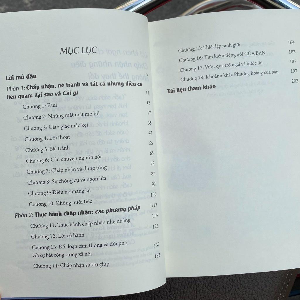 Cuốn sách được chia làm hai phần. Phần một sẽ đưa bạn đọc xem xét và tìm hiểu thế nào là chấp nhận, tại sao sự chấp nhận là quan trọng và cung cấp cho độc giả những ví dụ lâm sàng của những cá nhân khác - những người đang phải vật lộn với sự chấp nhận và hành trình sau đó của họ. Phần thứ hai của cuốn sẽ tập trung vào cách thực hành chấp nhận qua các bài thực hành cụ thể, cũng như cách để đối phó với những thử thách có thể xảy ra trên hành trình của bạn.